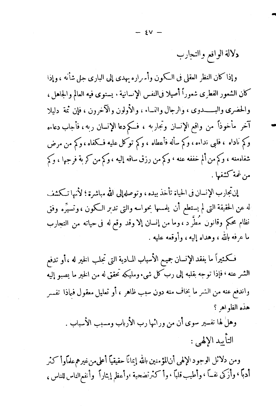 وإذا كان النظر العقلى فى الكون وأسراره يهدى إلى البارى جل شأنه، وإذا كان الشعور الفطرى شعورًا أصيلاً فى النفس الإنسانية، يستوى فيه العالم والجاهل، والحضرى والبدوى، والرجال والنساء، والأولون والآخرون، فإن ثمة دليلاً أخر مأخوذًا من واقع الإنسان وتجاربه، فكم دعا الإنسان ربه، فأجاب دعاءه، وكم ناداه فلبى نداءه، وكم سأله فأعطاه، وكم توكل عليه فكفاه، وكم من مرض شفاه منه، وكم من ألم خففه عنه، وكم من رزق ساقه إليه، وكم من كربة فرجها، وكم من غمة كشفها.