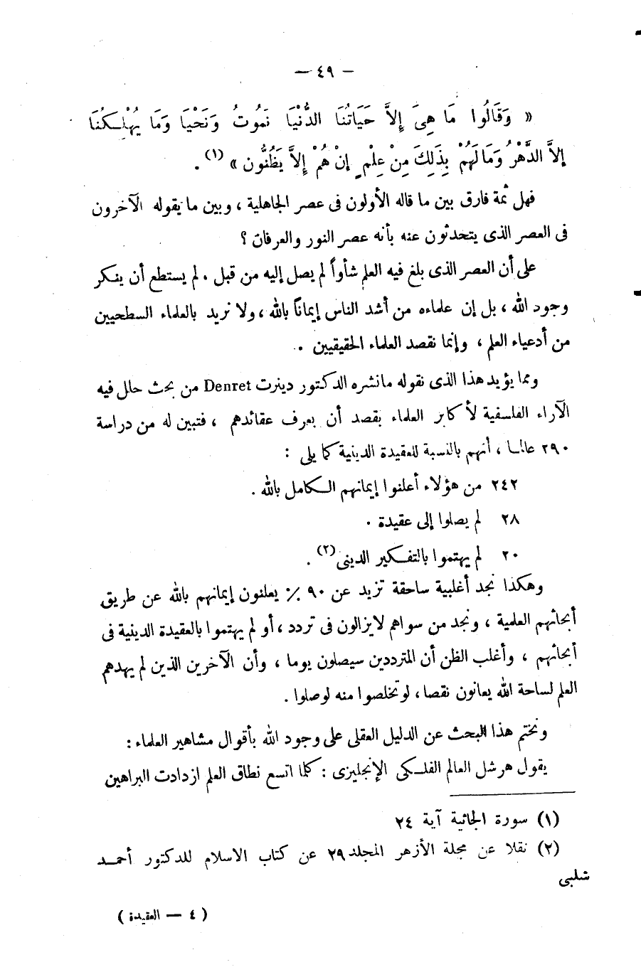 ومما يؤيد هذا الذى نقوله، ما نشره الدكتور (دينرت) من بحث حلل فيه الآراء الفلسفية لأكابر العلماء بقصد أن يعرف عقائدهم، فتبين له من دراسة 290 عالمًا، أنهم بالنسبة للعقيدة الدينية كما يلى: