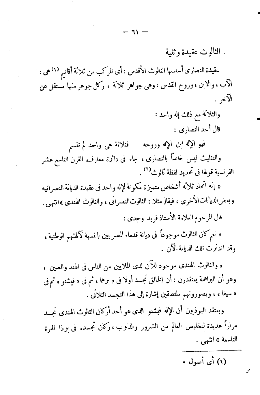 قال المرحوم العلامة الأستاذ/ فريد وجدى: " نعم كان الثالوث موجودًا فى ديانة قدماء المصريين بالنسبة لآلهتهم الوطنية، وقد اندثرت تلك الديانة الآن ".