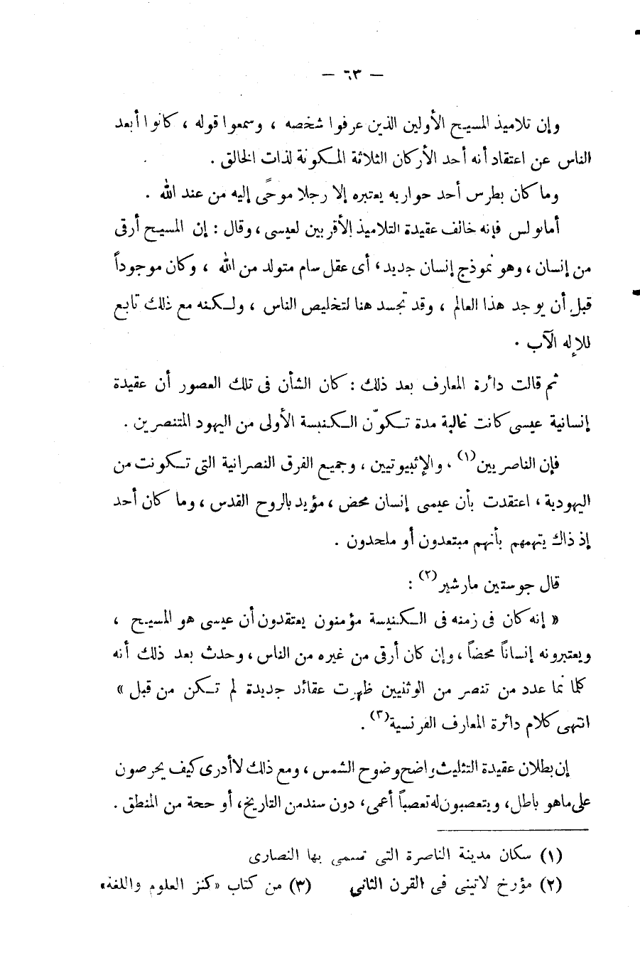 قال (جوستين مارشير) (¬2): " إنه كان فى زمنه فى الكنيسة مؤمنون يعتقدون أن عيسى هو المسيح، ويعتبرونه إنسانًا محضًا، وإن كان أرقى من غيره من الناس، وحدث بعد ذلك أنه كلما نما عدد من تنصر من الوثنيين ظهرت عقائد جديدة لم تكن من قبل " انتهى كلام دائرة المعارف الفرنسية (¬3).