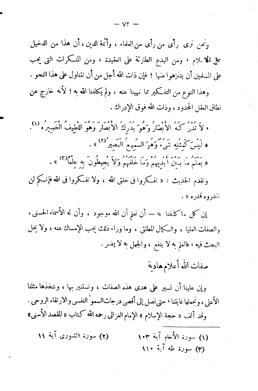 إن كل ما كلفنا به: أن نعلم أن الله موجود, وأن له الأسماء الحسنى, والصفات العليا, والكمال المطلق, وما وراء ذلك يجب الإمساك عنه, ولا يحل البحث فيه, فالعلم به لا ينفع, والجهل به لا يضر.
