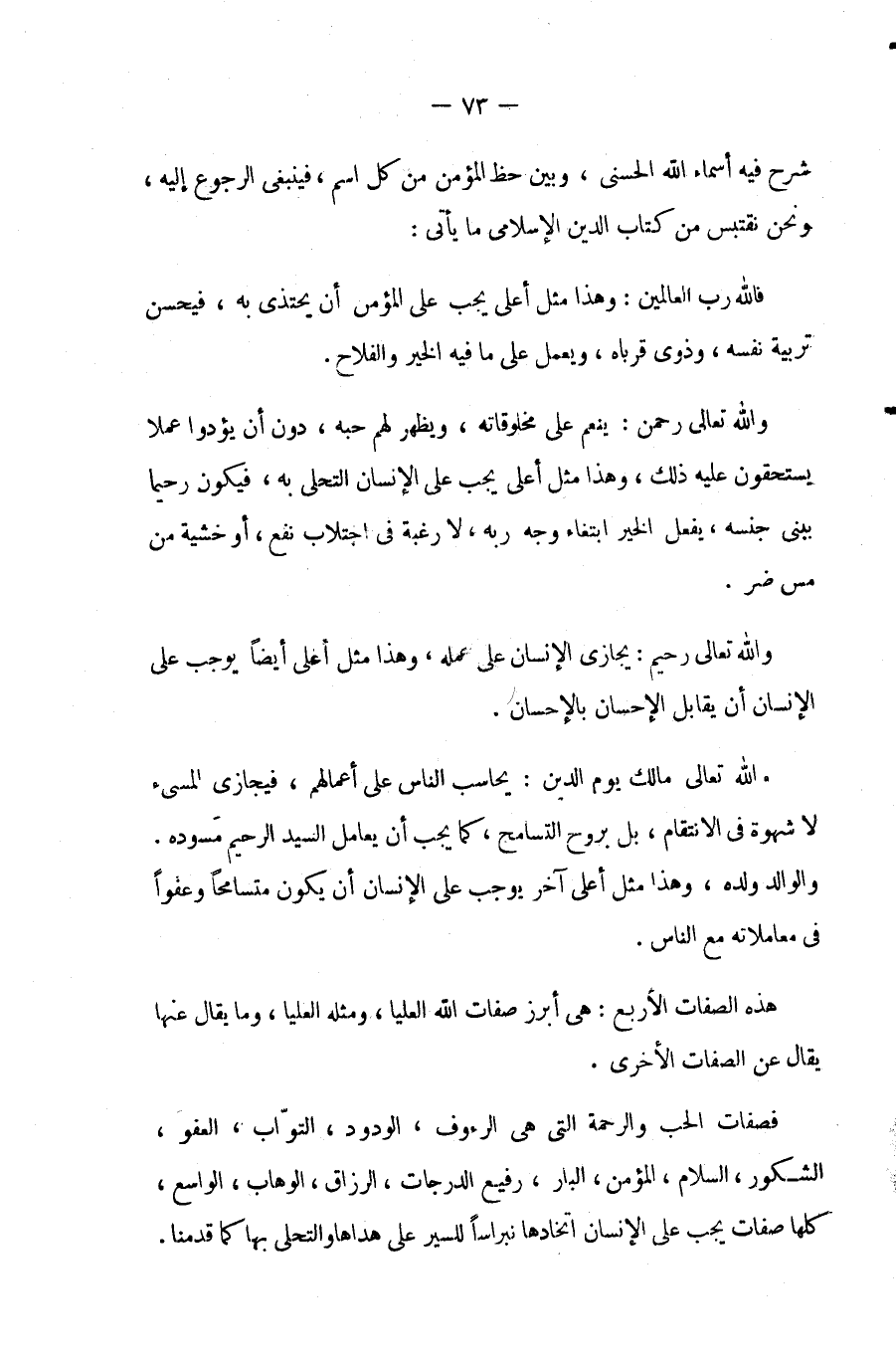 شرح فيه أسماء الله الحسنى, وبين حظ المؤمن من كل اسم, فينبغى الرجوع إليه, ونحن نقتبس من كتاب الدين الإسلامى ما يأتى: