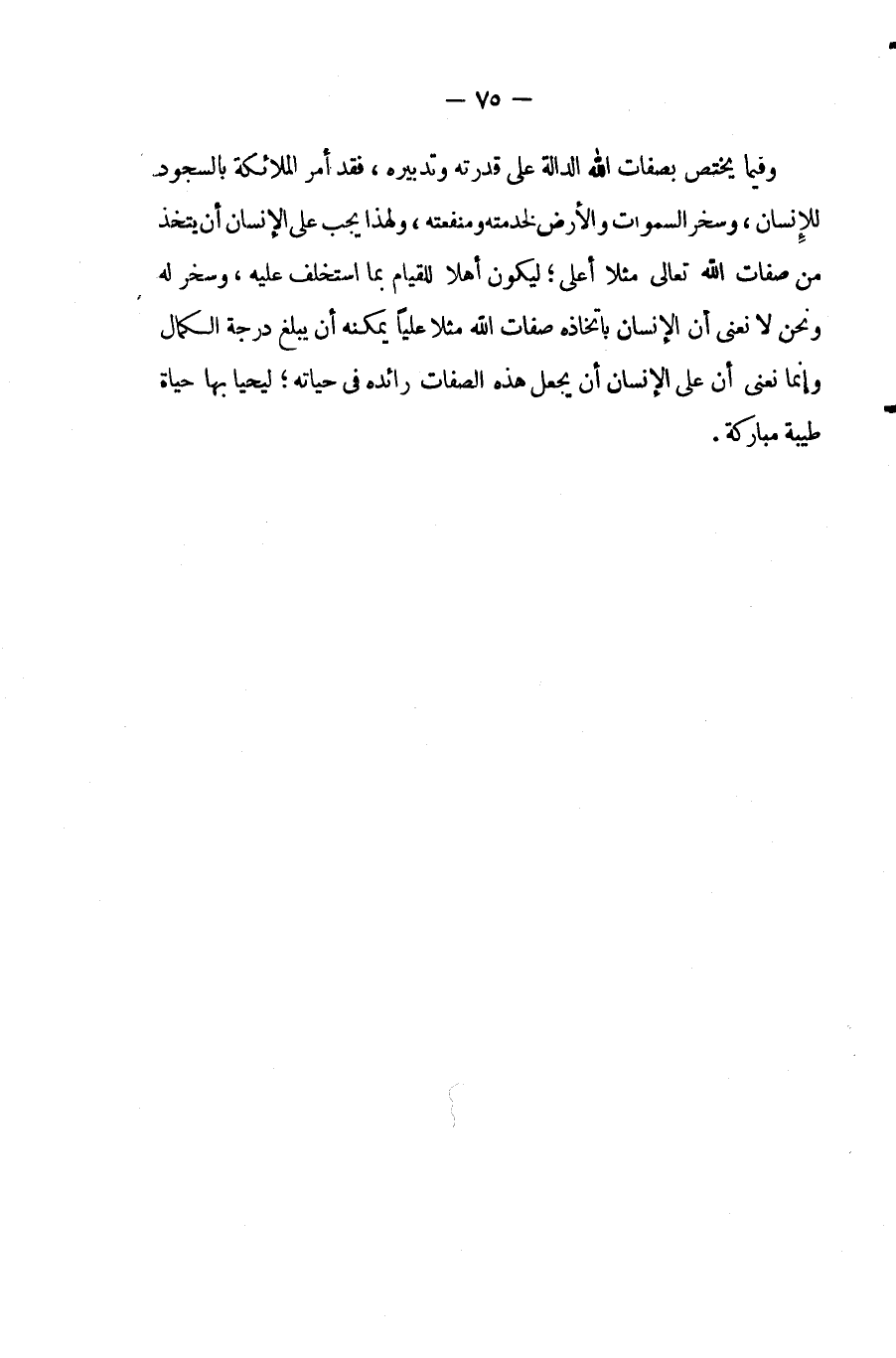 وفيما يختص بصفات الله الدالة على قدرته وتدبيره, فقد أمر الملائكة بالسجود للإنسان, وسخر السماوات والأرض لخدمته ومنفعته, ولهذا يجب على الإنسان أن يتخذ من صفات الله تعالى مثلاً أعلى؛ ليكون أهلاً للقيام بما استخلف عليه, وسخر له, ونحن لا نعنى أن الإنسان باتخاذه صفات الله مثلاً عليًا يمكنه أن يبلغ درجة الكمال, وإنما نعنى أن على الإنسان أن يجعل هذه الصفات رائدة فى حياته؛ ليحيا بها حياة طيبة مبارك