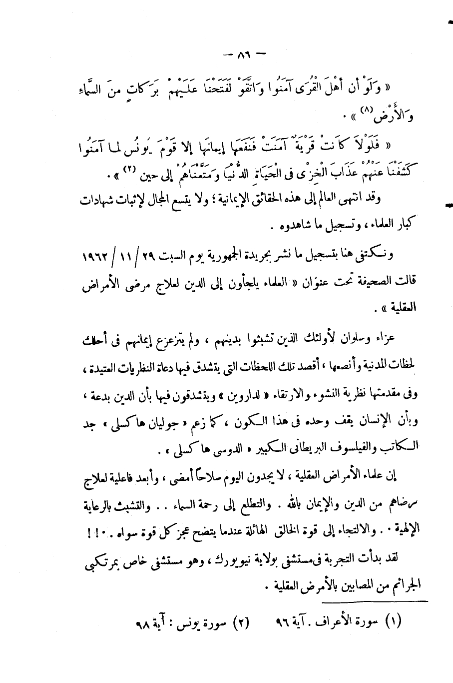 ونكتفى هنا بتسجيل ما نشر بجريدة الجمهورية, يوم السبت 29/ 11/1962م فقد قالت الصحيفة تحت عنوان (العلماء يلجأون إلى الدين لعلاج مرضى الأمراض العقلية):