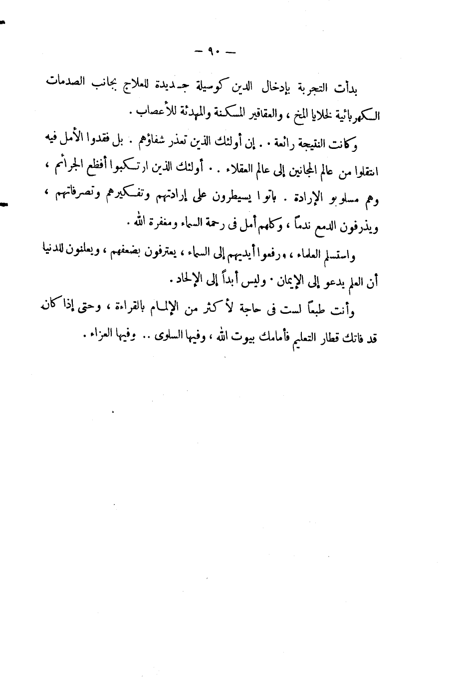 وكانت النتيجة رائعة .. إن أولئك الذين تعذر شفاؤهم, بل فقدوا الأمل فيه, انتقلوا من عالم المجانين إلى عالم العقلاء .. أولئك الذين ارتكبوا أفظع الجرائم, وهم مسلوبو الإرادة, باتوا يسيطرون على إرادتهم وتفكيرهم وتصرفاتهم, ويذرفون الدمع ندمًا, وكلهم أمل فى رحمة السماء ومغفرة الله.