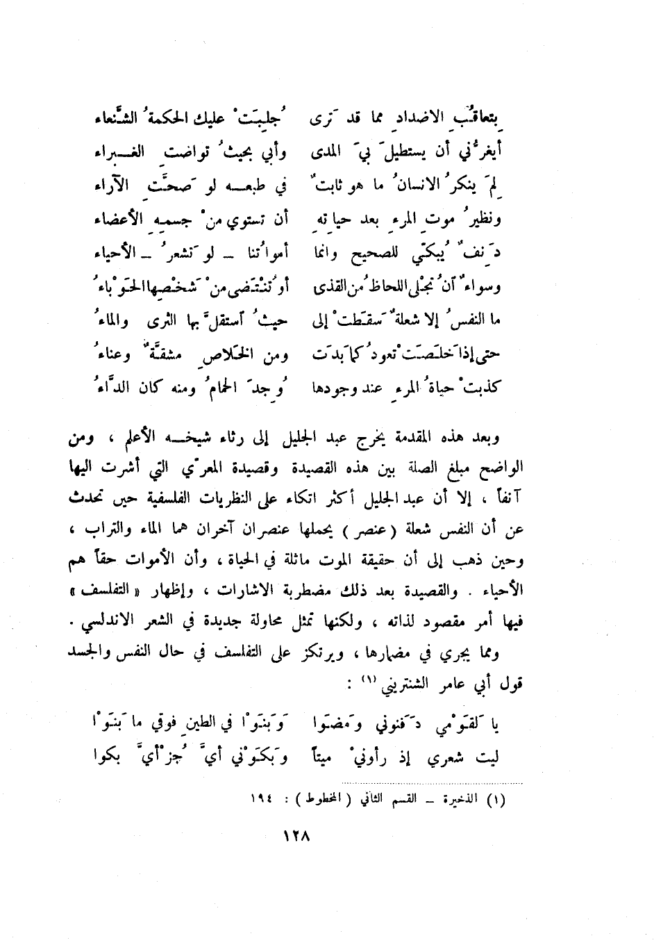 كذبت حياة المرء عند وجودها ... وجد الحمام ومنه كان الداء وبعد هذه المقدمة يخرج عبد الجليل إلى رثاء شيخه الأعلم، ومن الواضح مبلغ الصلة بين هذه القصيدة وقصيدة المعري التي أشرت إليها آنفا، إلا أن عبد الجليل أكثر اتكاء على النظريات الفلسفية حين تحدث عن أن النفس شعلة (عنصر) يحملها عنصران آخران هما الماء والتراب، وحين ذهب إلى أن حقيقة الموت مائلة في الحياة، وأن الأموات حقا هم الأحياء. والقصيدة بعد ذلك مضطربة الإشارات، وإظهار " التفلسف " فيها أمر مقصود لذاته، ولكنها تمثل محاولة جديدة في الشعر الأندلسي.