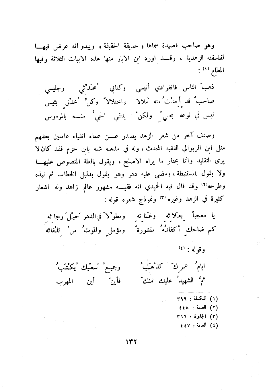 ليس في بحي ولكن ... يلتقي الحي منه بالمرموس وصنف آخر من شعر الزهد يصدر عن علماء أتقياء عاملين يعلمهم مثل ابن الريوالي الفقيه المحدث، وله في مذهبه شبه بابن حزم فقد كان لا يرى التقليد وانما يختار ما يراه الاصلح، ويقول بالعلة المنصوص عليها ولا يقول بالمستنبطة، ومضى ليه دهر وهو يقول بدليل الخطاب ثم نبذه وطرحه (2) وقد قال فيه الحميدي انه فقيه مشهور عالم زاهد وله أشعار كثيرة في الزهد وغيره (3) ونموذج شعره قوله: