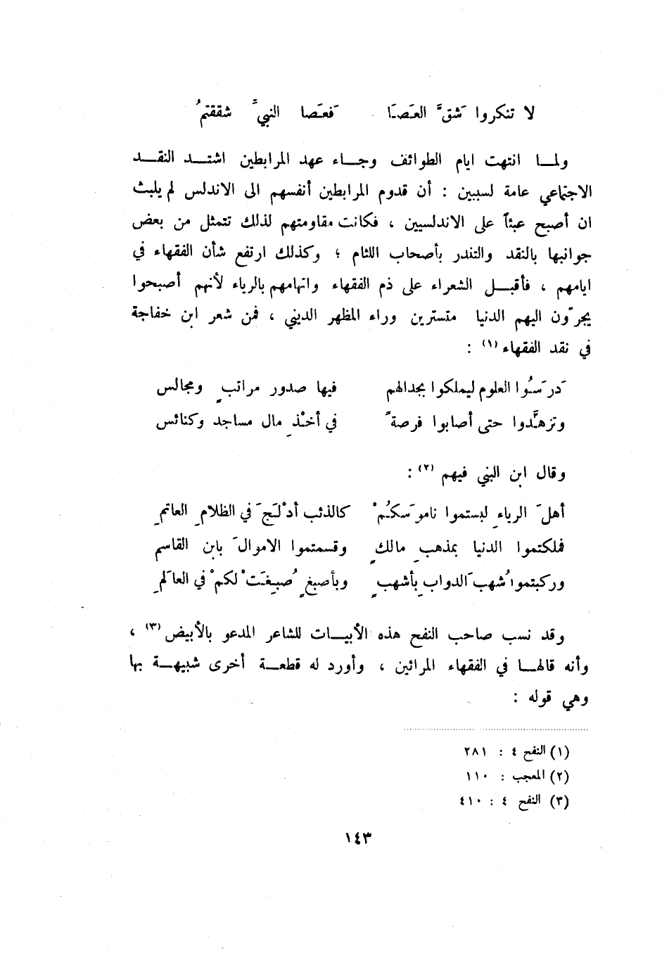 وركبتموا شهب الدواب بأشهب ... وبأصبغ صبغت لكم في العالم وقد نسب صاحب النفح هذه الأبيات للشاعر المدعو بالأبيض (3) ، وأنه قالها في الفقهاء المرائين، وأورد له قطعة أخرى شبيهة بها وهي قوله: