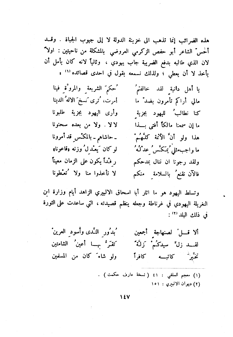 هذه الضرائب إنما تذهب إلى خزينة الدولة لا إلى جيوب الجباة. وقد أحس الشاعر أبو حفص الزكرمي العروضي بالمشكلة من ناحيتين: أولاً لان الذي طالبه بدفع الضريبة جاب يهودي، وثانيا لأنه كان يأمل أن يأخذ لا أن يعطي؛ ولذلك نسمعه يقول في إحدى قصائده (1) :