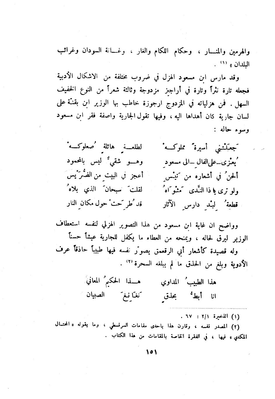 قطعه لبد دارس الآثار ... قد طرحت حول مكان النار وواضح ان غاية ابن مسعود من هذا التصور الهزلي لنفسه استعطاف الوزير ليرق الحال، ويمنح من العطاء ما يكفل للجارية عيشا حسنا وله قصيدة كأشعار أبي الرقعمق يصور نفسه فيها طبيبا حاذفا عرف الأدوية وبلغ من الحذق ما لم يبلغه السحرة (2) .