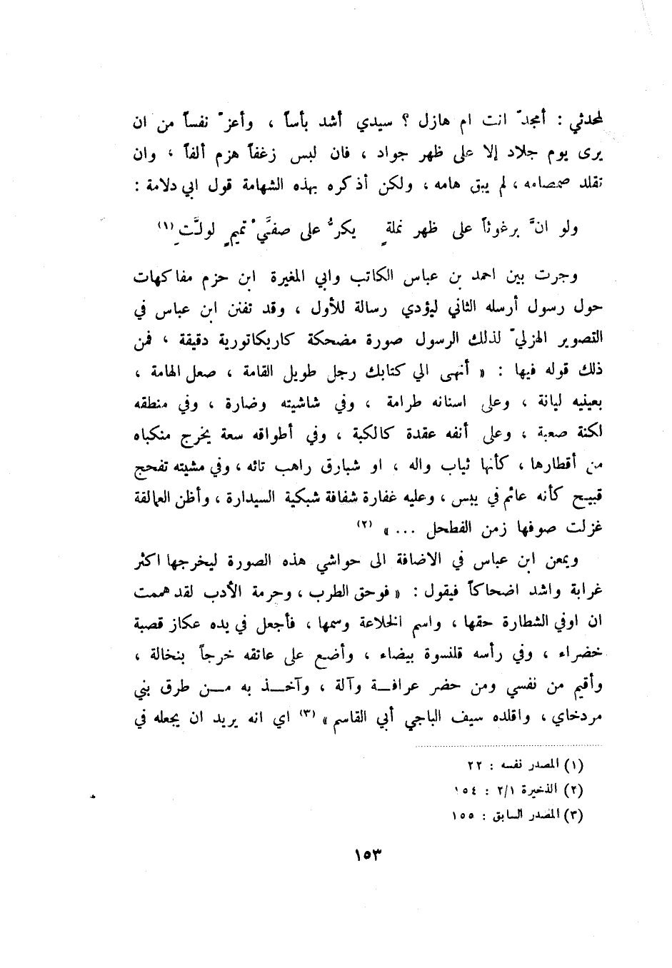 ولو أن برغوثا على ظهر نملة ... (1) يكر على صفي تميم لولت وجرت بين أحمد بن عباس الكاتب وابي المغيرة ابن حزم مفاكهات حول رسول أرسله ليؤدي رسالة للأول، وقد تفنن ابن عباس في التصوير الهزلي لذلك الرسول صورة مضحكة كاريكاتورية دقيقة، فمن ذلك قوله فيها: " أنهى الي كتابك رجل طويل القامة، صعل الهامة، بعينيه ليانة، وعلى أسنانه طرامة، وفي شاشيته وضارة، وفي منطقة لكنه صعبة، وعلى أنفه عقدة كالكبة، وفي أطواقه سعة يخرج منكاه من أقطاره، كأنها ثياب واله، أو شبارق راهب تائه، وفي مشيته تفحج قبيح كأنه عائم في يبس، وعليه غفارة شفافة شبكية السيدارة، وأظن العمالقة غزلت صوفها زمن الفطحل؟. " (2) .