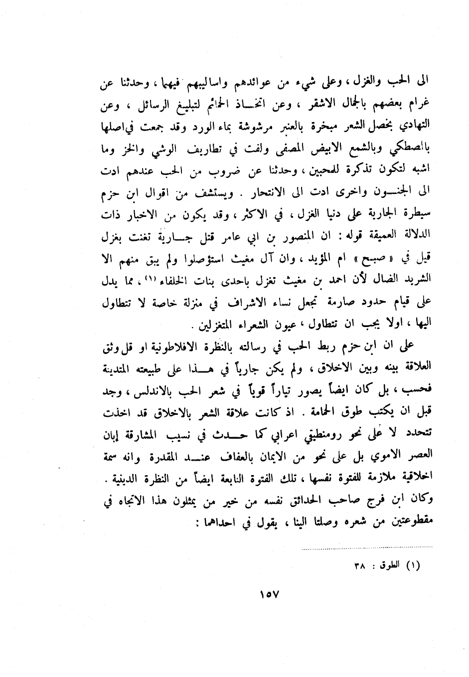 إلى الحب والغزل، وعلى شيء من عوائدهم وأساليبهم فيهما، وحدثنا عن غرام بعضهم بالجمال الأشقر، وعن اتخاذ الحمائم لتبليغ الرسائل، وعن التهادي بخصل الشعر مبخرة بالعنبر مرشوشة بماء الورد وقد جمعت في اصلها بالصطكي وبالشمع الأبيض المصفى ولفت في تطاريف الوشي والخز وما أشبه لتكون تذكرة للمحبين، وحدثنا عن ضروب من الحب عندهم أدت إلى الجنون وأخرى أدت إلى الانتحار. ويستشف من أقوال ابن حزم سيطرة الجارية على دنيا الغزل، في الأكثر، وقد يكون من الأخبار ذات الدلالة العميقة قوله: ان المنصور بن أبي عامر قتل جارية تغنت بغزل قيل فيه " صبح " أم مؤيد، وان آلا مغيث استؤصلوا ولم يبق منهم إلا الشريد الضال لأن أحمد بن مغيث تغزل بإحدى بنات الخلفاء (1) ، مما يدل على قيام حدود صارمة تجعل نساء الأشراف في منزلة خاصة لا تتطاول إليها، أولاً يجب أن تتطاول، عيون الشعراء المتغزلين.