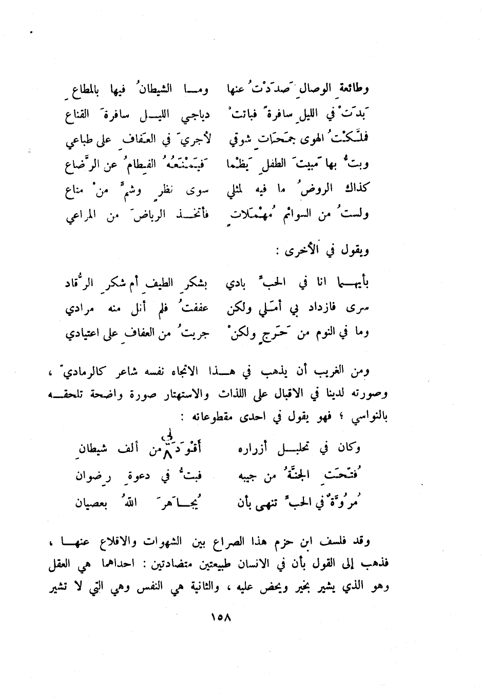 مروة في الحب تنهى بأن ... يجاهر الله بعصيان وقد فلسف ابن حزم هذا الصراع بين الشهوات والإقلاع عنها، فذهب إلى القول بأن في الإنسان طبيعتين متضادتين: إحداهما هي العقل وهو الذي يشير بخير ويحض عليه، والثانية هي النفس وهي التي لا تشير