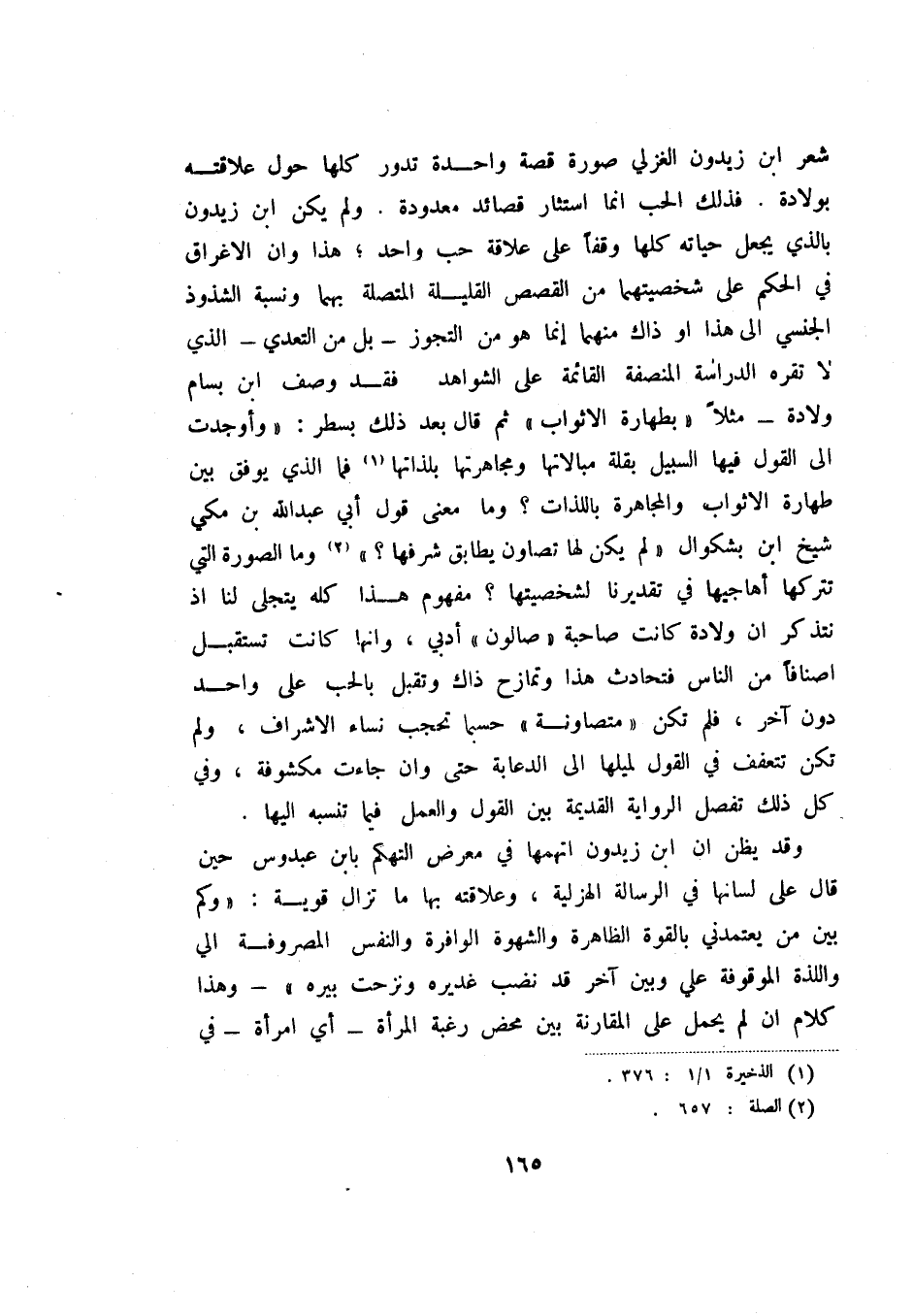 شعر ابن زيدون الغزلي صورة قصة واحدة تدور كلها حول علاقته بولادة. فذلك الحب إنما استثار قصائد معدومة. ولم يكن ابن زيدون بالذي يجعل حياته كلها وقفا على علاقة حب واحد؛ هذا وان الاغراق في الحكم على شخصيتهما من القصص القليلة المتصلة بهما ونسبة الشذوذ الجنسي إلى هذا أو ذاك منهما إنما هو من التجوز؟ بل من التعدي - الذي لا تقره الدراسة المنصفة القائمة على الشواهد فقد وصف ابن بسام ولادة - مثلا " بطهارة الأثواب " ثم قال بعد ذلك بسطر: " وأوجدت إلى القول فيها السبيل بقلة مبالاتها ومجاهرتها بلذاتها (1) فما الذي يوفق بين طهارة الأثواب والمجاهرة باللذات؟ وما معنى قول أبي عبد الله بن مكي شيخ ابن بسكوال " لم يكن لها تصاون يطابق شرفها؟ " (2) وما الصورة التي تتركها أهاجيها في تقديرنا لشخصيتها؟ مفهوم هذا كله يتجلى لنا إذ نتذكر أن ولادة كانت صاحبة " صالون " أدبي، وأنها كانت تستقبل أصنافاً من الناس فتحادث هذا وتمازح ذاك وتقبل بالحب على واحد دون آخر، فلم تكن " متصاونة " حسبما تحجب نساء الاشراف، ولم تكن تتعقق في القول لميلها إلى الدعابة حتى وان جاءت مكشوفة، وفي كل ذلك تفصل الرواية القديمة بين القول والعمل فيما تنسبه إليها.