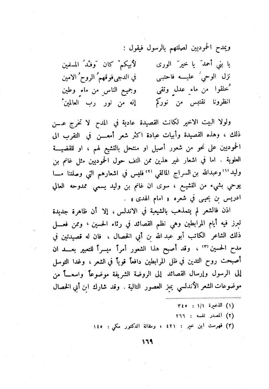 انظرونا نقتبس من نوركم ... إنه من نور رب العالمين ولولا البيت الأخير لكانت القصيدة عادية في المدح لا تخرج عن ذلك، وهذه القصيدة وأبيات عبادة اكثر شعر أمعن في التقرب إلى الحموديين على نحو من شعور أصيل أو منتحل بالتشيع لهم، أو للقضية العلوية. أما أشعار غير هذين ممن التف حول الحموديين مثل غانم بن وليد (1) وعبد الله بن السراج المالقي (2) فليس في أشعارهم التي وصلتنا ما يوحي بسيء من التشيع، سوى ان غانم بن وليد يسمي ممدوحه العالي إدريس بن يحيى في شعره " إمام الهدى ".