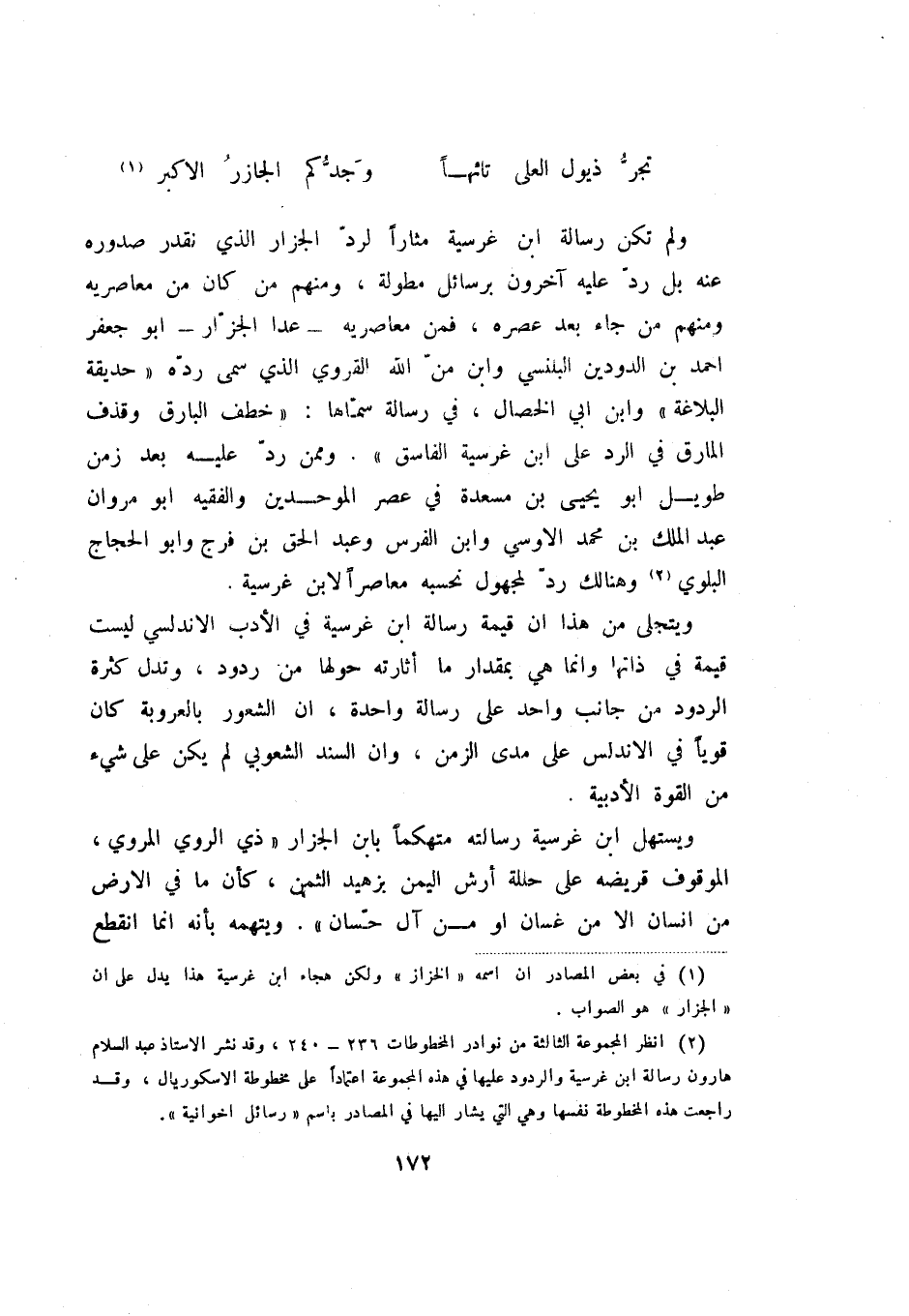 (2) انظر المجموعة الثالثة من نوادر المخطوطات 236 - 240، وقد نشر الأستاذ عبد السلام هارون رسالة ابن غرسية والردود عليها في هذه المجموعة اعتمادا على مخطوطة الاسكوريال، وقد راجعت هذه المخطوطة نفسها وهي التي يشار في المصادر باسم " رسائل اخوانية ".