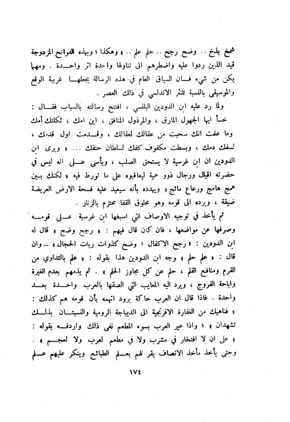 شمخ بذخ.. وضح رجح.. حلم علم.. " وهكذا، وبهذه الفواتح المزدوجة قيد الذين ردوا عليه واضطرهم إلى تناولها واحدة اثر واحدة. ومهما يكن من شيء فان السياق العام في هذه الرسالة يجعلها غريبة الوقع والموسيقى بالنسبة للنثر الأندلسي قي ذلك العصر.