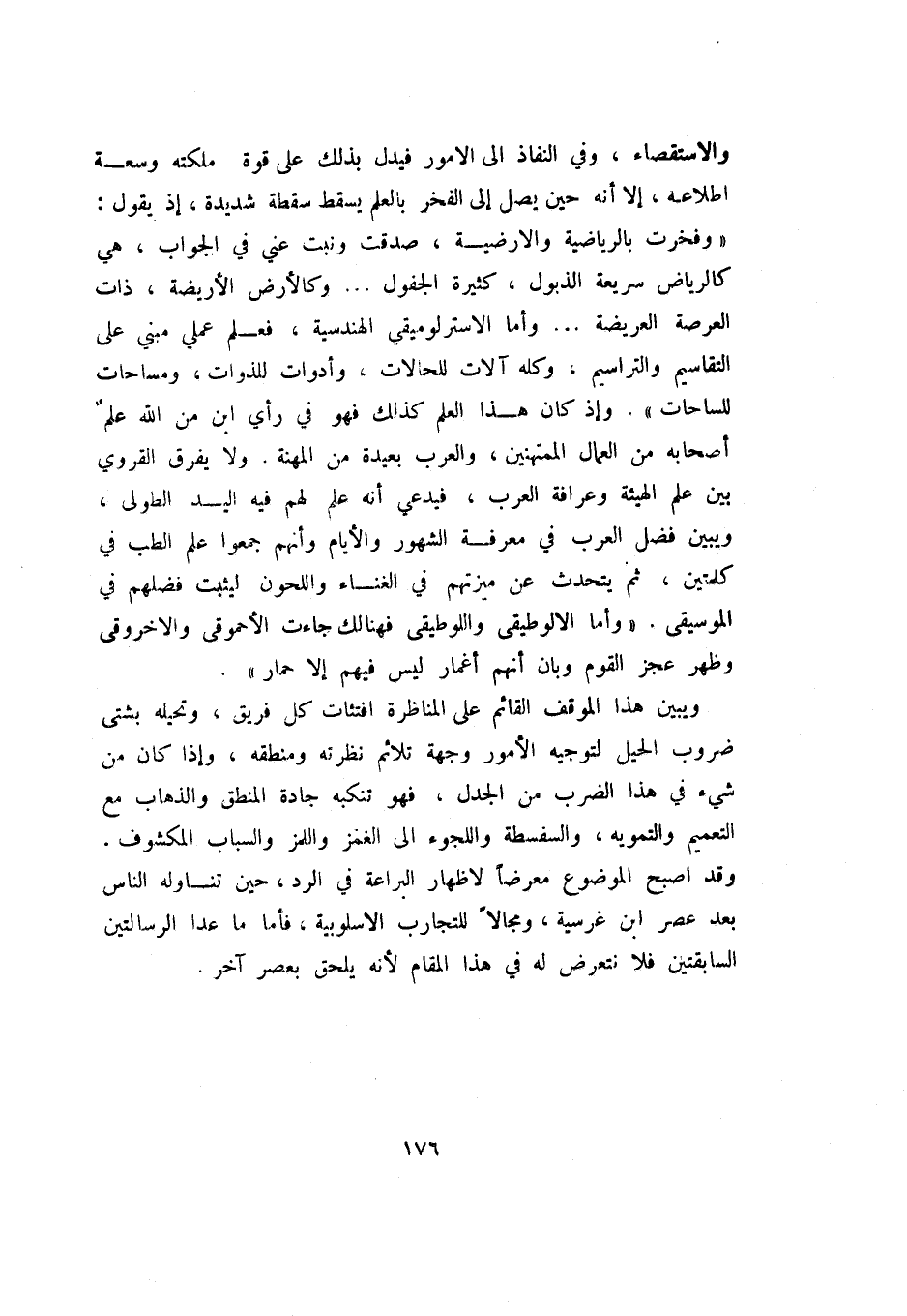 والاستقصاء، وفي النفاذ إلى الأمور فيدل بذلك على قوة ملكه وسعة اطلاعه، إلا أنه حين يصل إلى الفخر بالعلم يسقط سقطة شديدة، إذ يقول: " وفخرت بالرياضية والأرضية، صدقت ونبت عني في الجواب، هي كالرياض سريعة الذبول، كثيرة الجفول؟. وكالأرض الأريضة، ذات العرصة العريصة؟ وأما الاسترلوميقي الهندسية، فعلم عملي مبني على التقاسيم والتراسيم، وكله آلات للحالات، وأدوات للذوات، ومساحات للساحات ". وإذ كان هذا العلم كذلك فهو في رأي ابن من الله علم أصحابه من العمال الممتهنين، والعرب بعيدة من المهنة. ولا يفرق القروي بين علم الهيئة وعرافة العرب، فيدعي أنه علم لهم فيه اليد الطولى، ويبين فضل العرب في معرفة الشهور والأيام وانهم جمعوا علم الطب في كلمتين، ثم يتحدث عن ميزتهم في الغناء واللحون ليثبت فضلهم في الموسيقى. " وأما الالوطيقى واللوطيقى فهنالك جاءت الأحموقى والاخروقى وظهر عجز القوم وبان أنهم أغمار ليس فيهم إلا حمار ".
