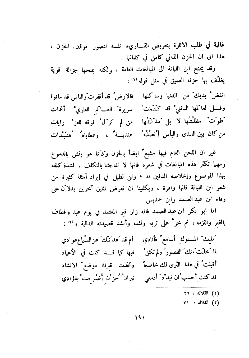 من كان بين الندى والبأس انصله ... هندية، وعطاياه هنيدات غير ان اللحن العام فيها مشبع أيضا بالحزن وكأنما هو ينش بالدموع ومهما تكثر هذه المبالغات في شعره فأنها لا تفاجئنا بالتكلف، لشدة كلفه بهذا الموضوع وإخلاصه الدفين له، ولن نطيل في إيراد أمثلة كثيرة من شعر ابن اللبانة فأنها وافرة، ويكفينا أن نعرض لمثلين آخرين يدلان على وفاء ابن عبد الصمد وابن حمديس.
