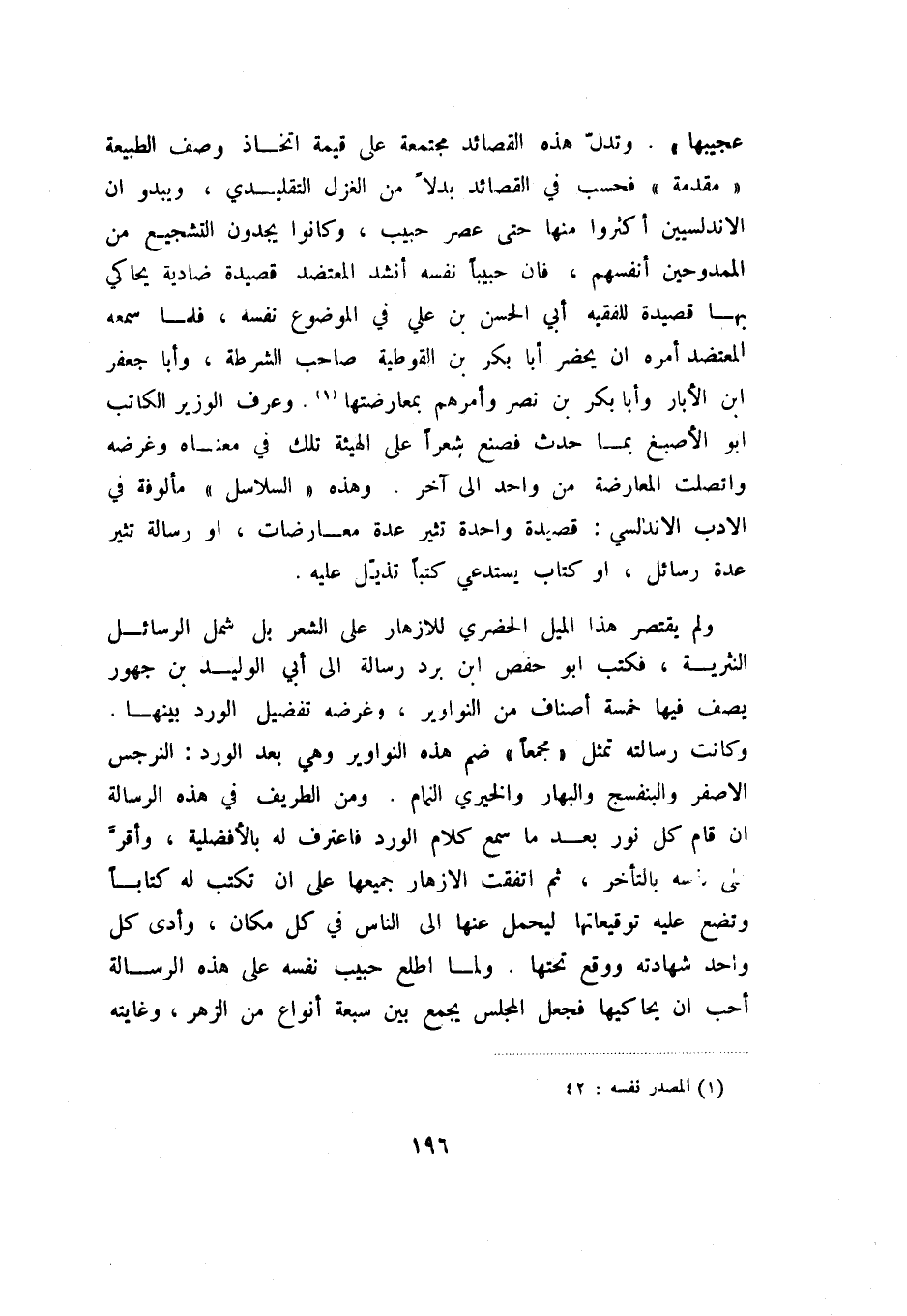 عجيبها ". وتدل هذه القصائد مجتمعة على قيمة اتخاذ وصف الطبيعة " مقدمة " فحسب في القصائد بدلا من الغزل التقليدي، ويبدو ان الأندلسيين أكثروا منها حتى عصر حبيب، وكانوا يجدون التشجيع من الممدوحين أنفسهم، فان حبيبا نفسه أنشد المعتضد قصيدة ضادية يحاكي بها قصيدة للفقيه أبي الحسن بن علي في الموضوع نفسه، فلما سمعه المعتضد أمره ان يحضر أبا بكر بن القوطية صاحب الشرطة، وأبا جعفر ابن الأبار وأبا بكر بن نصر وأمرهم بمعارضتها (1) . وعرف الوزير الكاتب أبو الأصبغ بما حدث فصنع شعرا على الهيئة تلك في معناه وغرضه واتصلت المعارضة من واحد إلى آخر. وهذه " السلاسل " مألوفة في الأدب الأندلسي: قصيدة واحدة تثير عدة معارضات، أو رسالة تثير عدة رسائل، أو كتاب يستدعي كتبا تذيل عليه.
