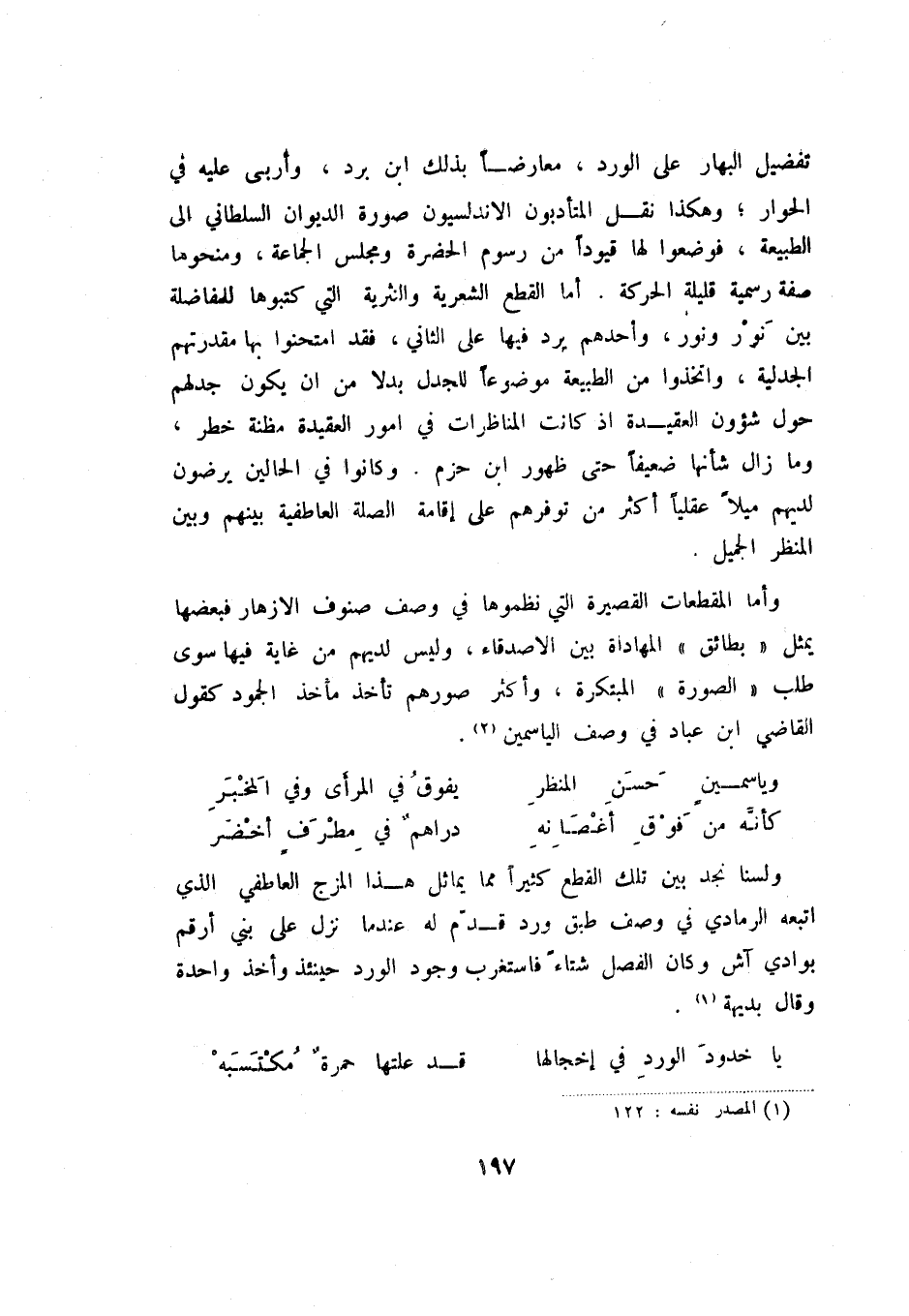 تفضيل البهار على الورد، معارضا بذلك ابن برد، وأربى عليه في الحوار؛ وهكذا نقل المتأدبون الأندلسيون صورة الديوان السلطاني إلى الطبيعة، فوضعوا لها قيودا من رسوم الحضرة ومجلس الجماعة، ومنحوها صفة رسمية قليلة الحركة. أما القطع الشعرية والنثرية التي كتبوها للمفاضلة بين نور ونور، وأحدهم يرد فيها على الثاني، فقد امتحنوا بها مقدرتهم الجدلية، واتخذوا من الطبيعة موضوعا للجدل بدلا من ان يكون جدلهم حول شؤون العقيدة اذ كانت المناظرات في امور العقيدة مظنة خطر، وما زال شأنها ضعيفا حتى ظهور ابن حزم. وكانوا في الحالين برضون لديهم ميلا عقليا أكثر من توفرهم على إقامة الصلة العاطفية بينهم وبين المنظر الجميل.
