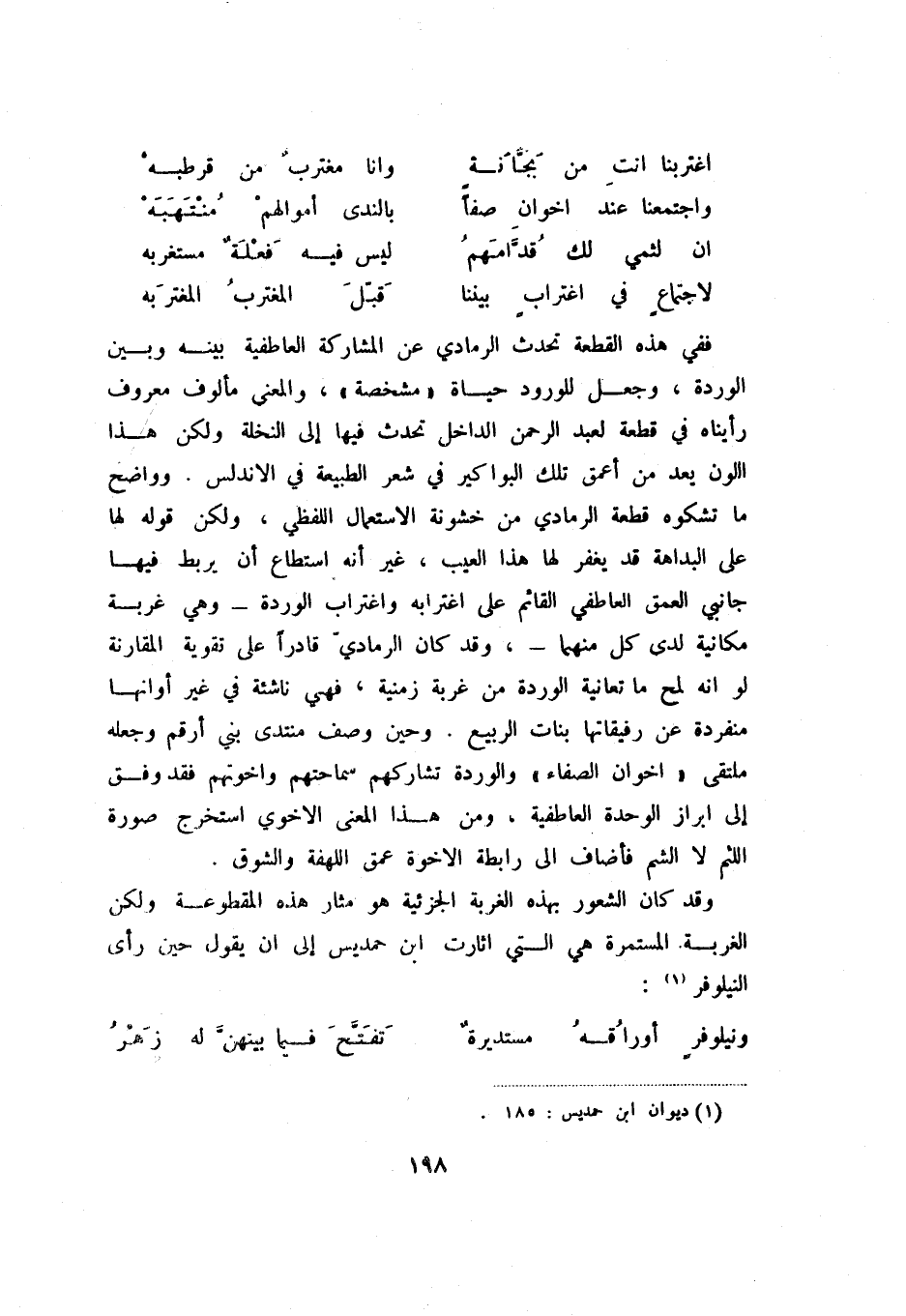 وقد كان الشعور بهذه الغربة الجزئية هو مثار هذه المقطوعة ولكن الغربة المستمرة هي التي أثارت ابن حمديس إلى أن يقول حين رأى النيلوفر (1) :