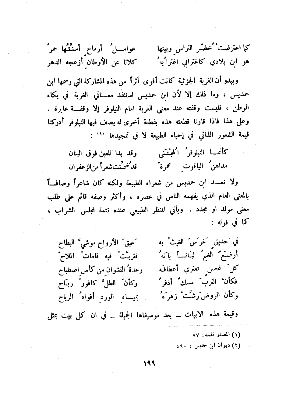 هو ابن بلادي كاغترابي اغترابه ... كلانا عن الأوطان أزعجه الدهر ويبدو أن الغربة الجزئية كانت أقوى أثراً من هذه المشاركة التي رسمها ابن حمديس، وما ذلك إلا لأن ابن حمديس استنفذ معني الغربة في بكاء الوطن، فليست وقفته عند معنى الغربة أمام النيلوفر إلا وقفة عابرة. وعلى هذا فإذا قارنا قطعته هذه بقطعة أخرى له يصف فيها انيلوفر أدركنا قيمة الشعور الذاتي في إحياء الطبيعة لا في تمجيدها (1) :