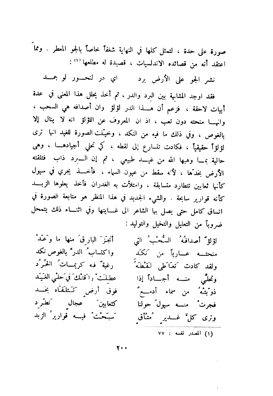 نشر الجو على الأرض برد ... أي در لنحور لو جمد فقد أوجد المشابهة بين البرد والدر، ثم أخذ يحلل هذا المعنى في عدة أبيات لاحقة، فزعم أن هذا الدر لؤلؤ وان أصدافه هي السحب، وانها منحته منحة دون تعب، إذ أن المعروف عن اللؤلؤ انه لا ينال إلا بالغوص، وفي ذلك ما فيه من النكد، وخيلت الصورة للغيد أنها ترى لؤلؤا حقيقيا، فكادت تتسارع إلى لقطة، كي تحلي أجيادها، وهي حالية بما وهبها الله من غيد طبيعي، ثم إن البرد ذاب فتلقته الأرض بخدها، لأنه سقط من عيون السماء، فأخذ يجري في سيول كأنها ثعابين تتطارد متسابقة، وامتلأت به الغدران فأخذ يعلوها الزبد كأنه قوارير سابحة. والشيء الجديد في هذا المنظر هو متابعة الصورة في اتساق كامل حتى يصل بها الشاعر إلى غايتها وفي أثناء ذلك يتمحل ضروبا من التعليل والتخيل والتوليد: