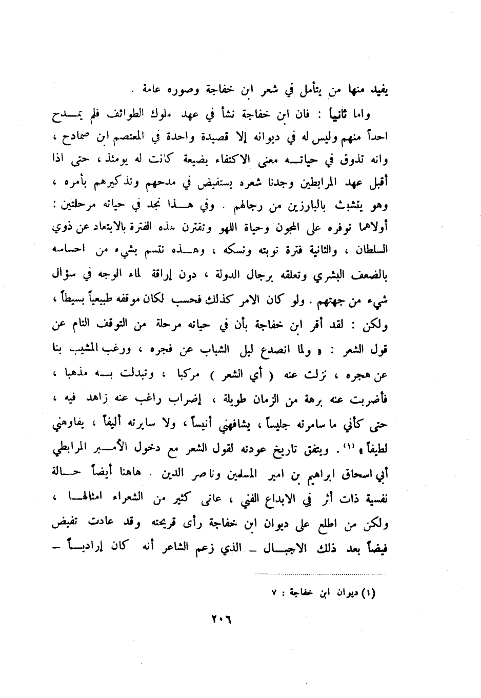 وأما ثانيا: فان ابن خفاجة نشأ في عهد ملوك الطوائف فلم يمدح أحداً منهم وليس له في ديوانه إلا قصيدة واحدة في المعتصم ابن صمادح، وانه تذوق في حياته معنى الاكتفاء بصيغة كانت له يومئذ، حتى إذا أقبل عهد المرابطين وجدنا شعره يستفيض في مدحهم وتذكيرهم بأمره، وهو يتشبت بالبارزين من رجالهم. وفي هذا نجد في حياته مرحلتين: أولاهما توفره على المجون وحياة اللهو وتفترن هذه الفترة بالابتعاد عن ذوي السلطان، والثانية فترة توبته ونسكه، وهذه تتسم بشيء من إحساسه بالضعف البشري وتعلقه برجال الدولة، دون إراقة لماء الوجه في سؤال شيء من جهتهم. ولو كان الأمر كذلك فحسب لكان موقفه طبيعيا بسيطا، ولكن: لقد أقر ابن خفاجة بأن في حياته مرحلة من التوقف التام عن قول الشعر: " ولما انصدع ليل الشباب عن فجره، ورغب المشيب بنا عن هجره، نزلت عنه (أي الشعر) مركبا، وتبدلت به مذهبا، فأضربت عنه برهة من الزمان الطويلة، اضطراب راغب عنه زاهد فيه، حتى كأني ما سامرته جليسا، يشافهني أنيسا، ولا سايرته أليفا، يفاوهني لطيفا " (1) . ويتفق تاريخ عودته لقول الشعر مع دخول الأمير المرابطي أبي إسحاق إبراهيم بن أمير المسلمين وناصر الدين هاهنا أيضا حالة نفسية ذات أثر في الإبداع الفني، عانى كثير من الشعراء أمثالها، ولكن من اطلع على ديوان ابن خفاجة رأى قريحته وقد عادت تفيض فيضا بعد ذلك الأجيال؟ الذي زعم الشاعر انه كان إراديا -