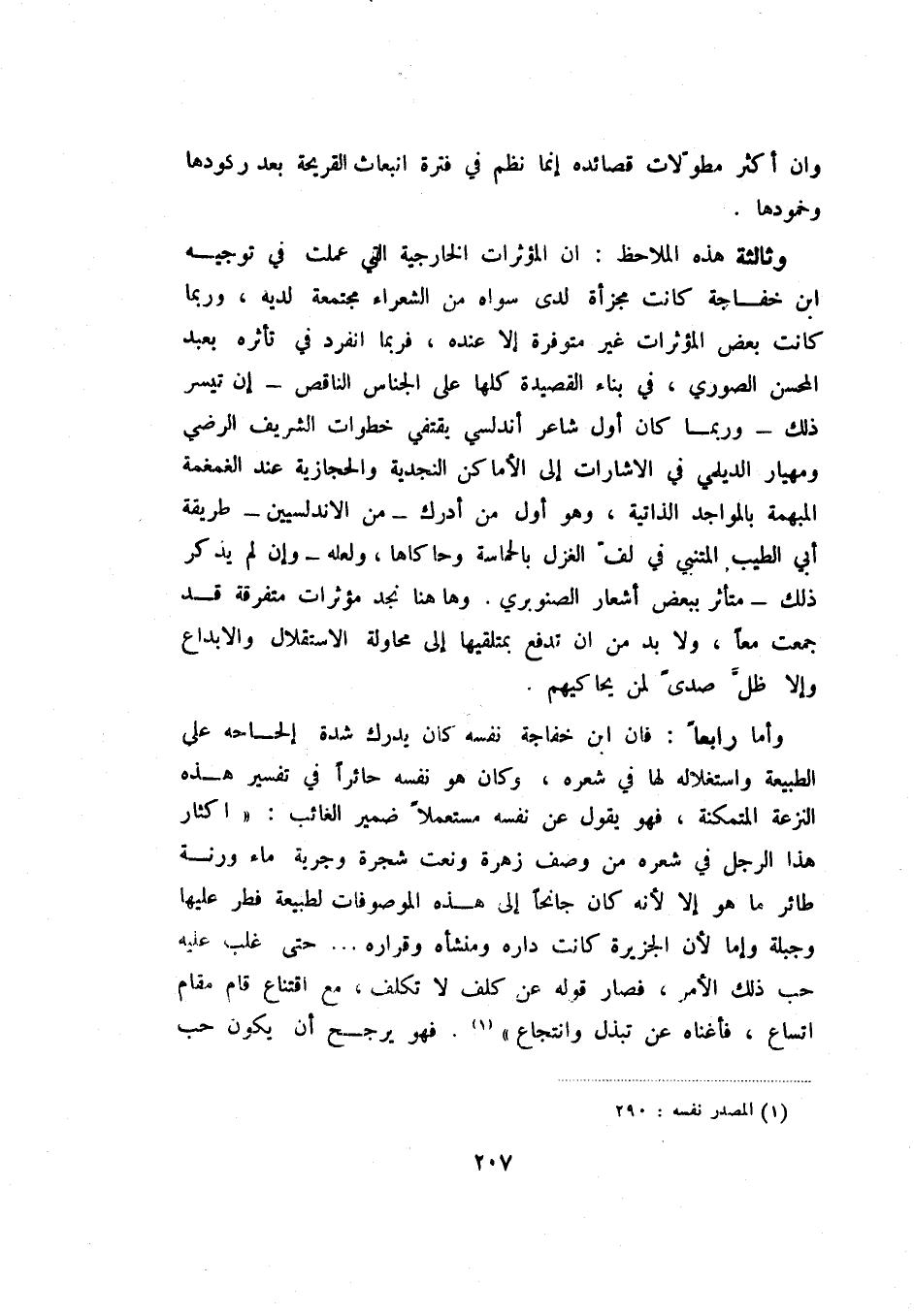 وأما رابعا: فان ابن خفاجة نفسه كان يدرك شدة إلحاحه على الطبيعة واستغلاله لها في شعره، وكان هو نفسه حائرا في تفسير هذه النزعة المتمكنة، فهو يقول عن نفسه مستعملا ضمير الغائب: " إكثار هذا الرجل في شعره من وصف زهرة ونعت شجرة وجربة ماء ورنة طائر ما هو إلا لأنه كان جانحا إلى هذه الموصوفات لطبيعة فطر عليها وجبلة وإما لأن الجزيرة كانت داره ومنشأه وقراره؟. حتى غلب عليه حب ذلك الأمر، فصار قوله عن كلف لا تكلف، مع اقتناع قام مقام اتساع، فأغناه عن تبذل وانتجاع " (1) . فهو يرجح أن يكون حب