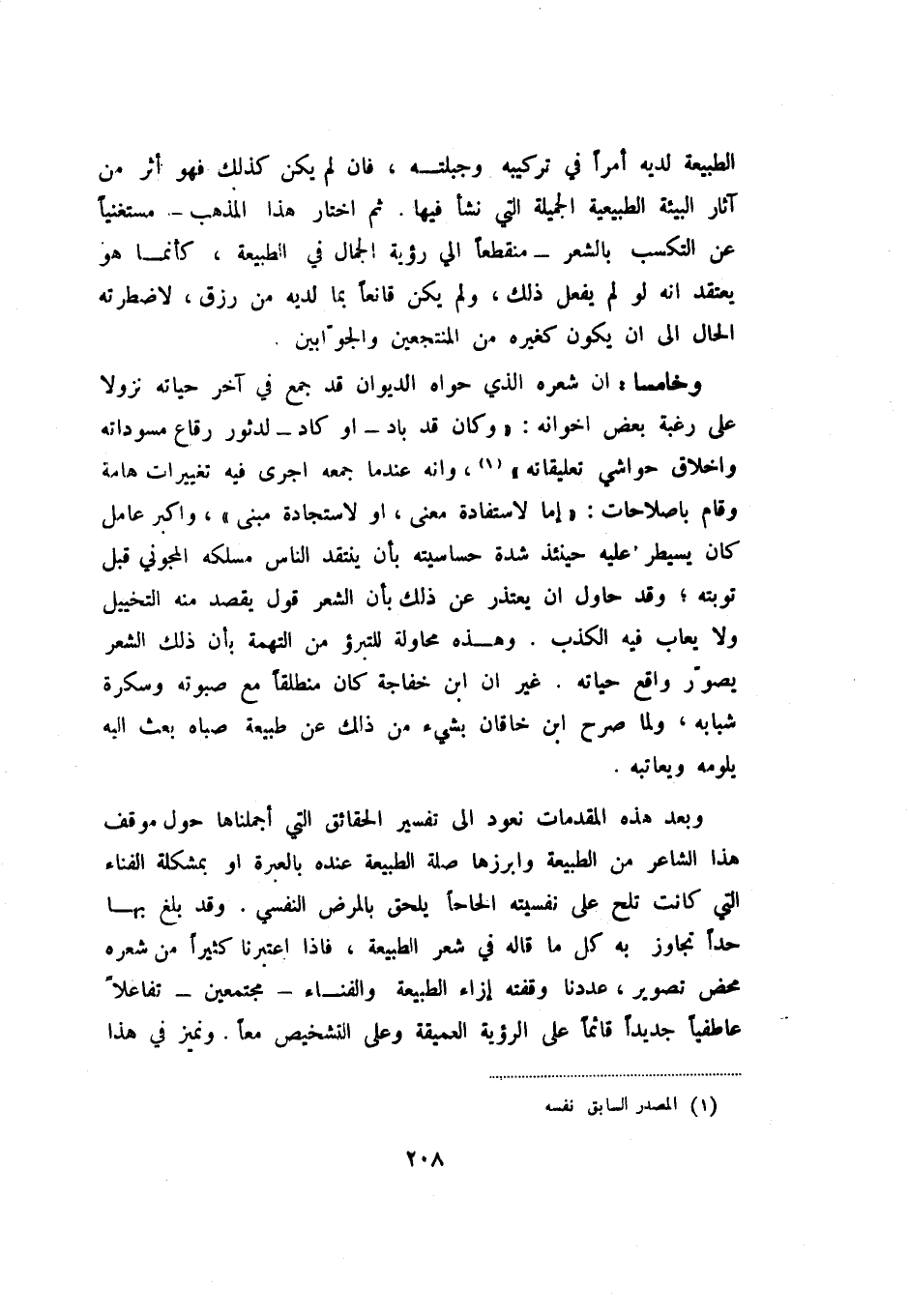 وبعد هذه المقدمات نعود إلى تفسير الحقائق التي أجملناها حول موقف هذا الشاعر من الطبيعة وأبرزها صلة الطبيعة عنده بالعبرة أو بمشكلة الفناء التي كانت تلح على نفسيته إلحاحا يلحق بالمرض النفسي. وقد بلغ بها حدا تجاوز به كل ما قاله في شعر الطبيعة، فإذا اعتبرنا كثيرا من شعره محض تصوير، عددنا وقفته إزاء الطبيعة والفناء؟ مجتمعين - تفاعلا عاطفيا جديدا قائما على الرؤية العميقة وعلى التشخيص معا. ونميز في هذا