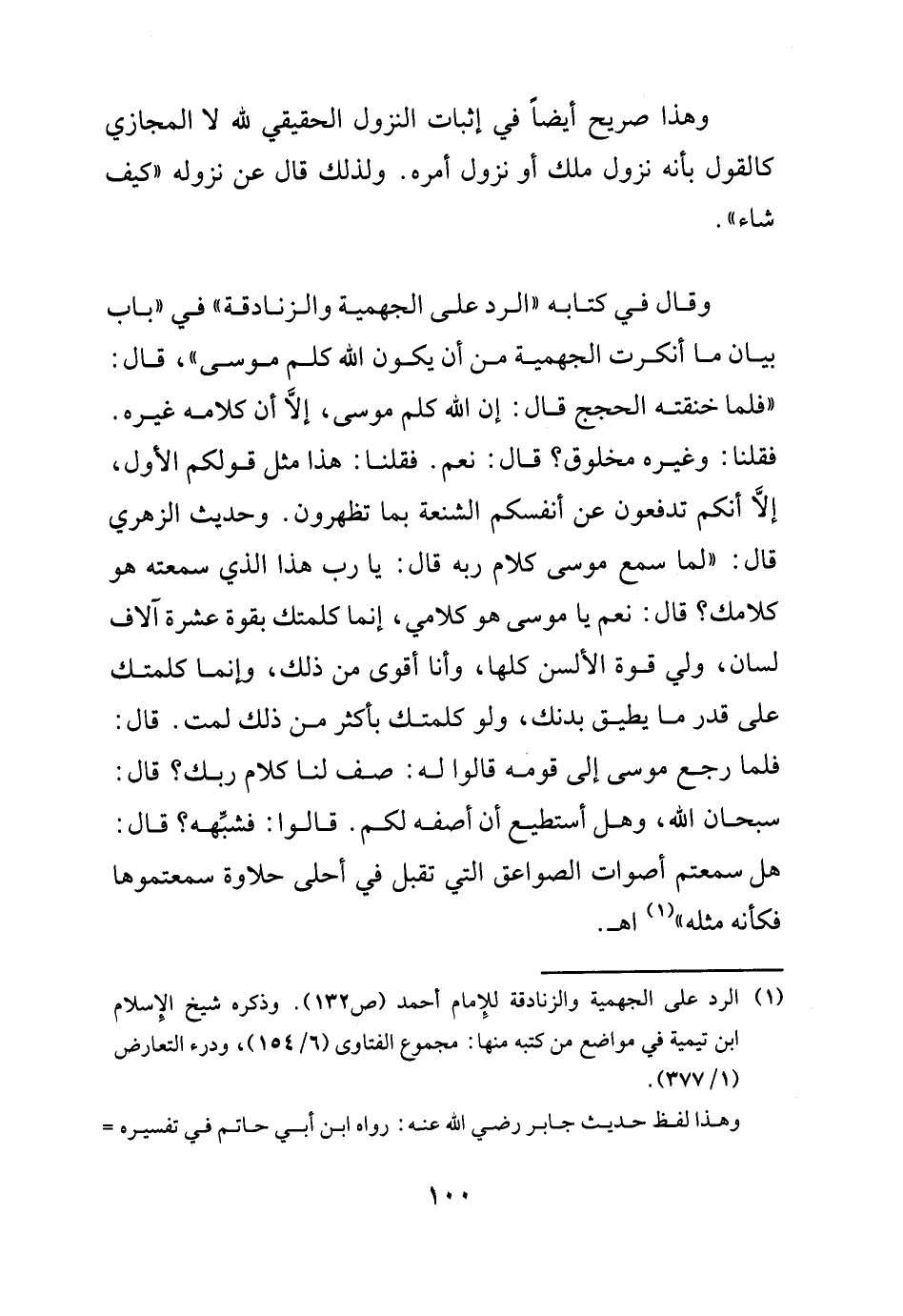 وقال في كتابه "الرد على الجهمية والزنادقة" في "باب بيان ما أنكرت الجهمية من أن يكون الله كلم موسى": (قال أحمد رضى الله عنه فلما خنقته الحجج قال: إن الله كلم موسى، إلا أن كلامه غيره. فقلنا: وغيره مخلوق؟ قال: نعم. فقلنا: هذا مثل قولكم الأول، إلا أنكم تدفعون عن أنفسكم الشنعة بما تظهرون. وحديث الزهري قال: "لما سمع موسى كلام ربه قال: يا رب هذا الذي سمعته هو كلامك؟ قال: نعم يا موسى هو كلامي، إنما كلمتك بقوة عشرة آلاف لسان، ولي قوة الألسن كلها، وأنا أقوى من ذلك، وإنما كلمتك على قدر ما يطيق بدنك، ولو كلمتك بأكثر من ذلك لمت.