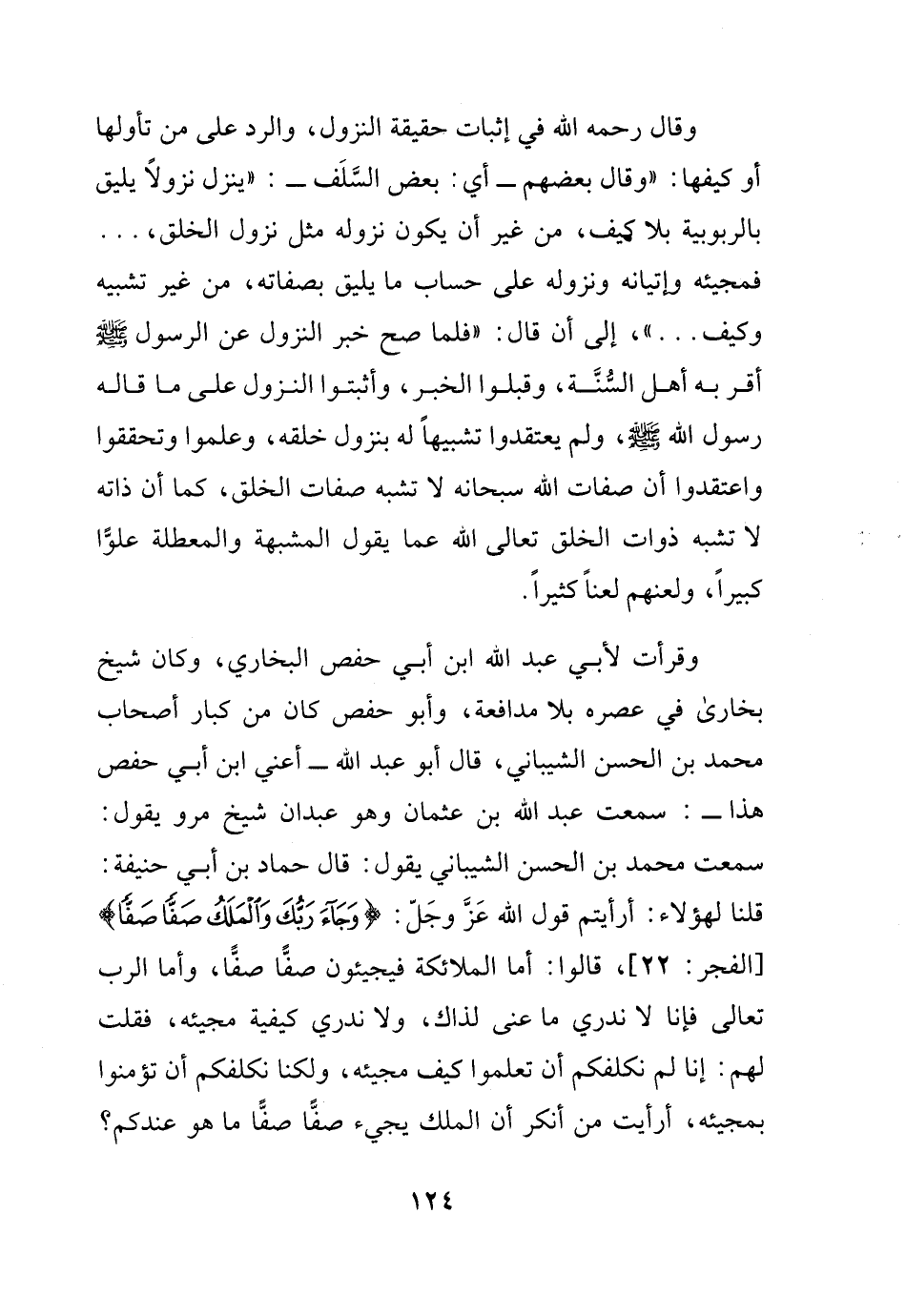 وقرأت لأبى عبد الله ابن أبي جعفر البخاري، وكان شيخ بخارى في عصره بلا مدافعة، وأبو حفص كان من كبار أصحاب محمد بن الحسن الشيباني، قال أبو عبد الله:- أعني ابن أبى حفص هذا- سمعت عبد الله بن عثمان وهو عبدان شيخ مرو يقول: سمعت محمد بن الحسن الشيباني يقول: قال حماد بن أبي حنيفة: قلنا لهؤلاء: أرأيتم قول الله عز وجل {وجاء ربك والملك صفا صفا} الفجر22، قالوا: أما الملائكة فيجيئون صفاً صفاً، وأما الرب تعالى فإنا لا ندري ما عنى لذاك، ولا ندري كيفية مجيئه، فقلت لهم: إنا لم نكلفكم أن تعلموا كيف مجيئه، ولكنا نكلفكم أن تؤمنوا بمجيئه، أرأيت من أنكر أن الملك يجيء صفاً صفاً ما هو عندكم؟