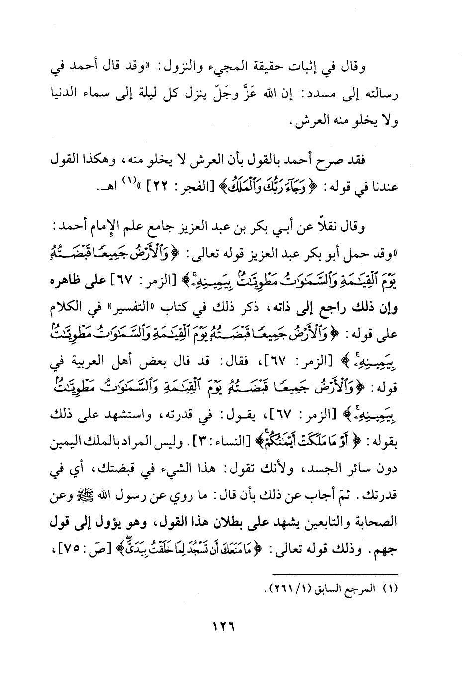 وقال نقلاً عن أبي بكر بن عبد العزيز جامع علم الإمام أحمد: (وقد حمل أبو بكر عبد العزيز قوله تعالى {والأرض جميعاً قبضته يوم القيامة والسماوات مطويات بيمينه} الزمر67، على ظاهره وأن ذلك راجع إلى ذاته، ذكر ذلك في كتاب "التفسير" في الكلام على قوله {والأرض جميعاً قبضته يوم القيامة} الزمر67، فقال: قد قال بعض أهل العربية في قوله {والأرض جميعاً قبضته يوم القيامة والسماوات مطويات بيمينه} الزمر67، يقول: في قدرته، واستشهد على ذلك بقوله {أو ما ملكت أيمانكم} النساء3. وليس المراد بالملك اليمين دون سائر الجسد، ولأنك تقول: هذا الشيء في قبضتك، أي في قدرتك. ثم أجاب عن ذلك بأن قال: ما روي عن رسول الله - صلى الله عليه وسلم - وعن الصحابة والتابعين يشهد على بطلان هذا القول، وهو يؤول إلى قول جهم. وذلك قوله تعالى {ما منعك أن تسجد لما خلقت بيدي} ص75،