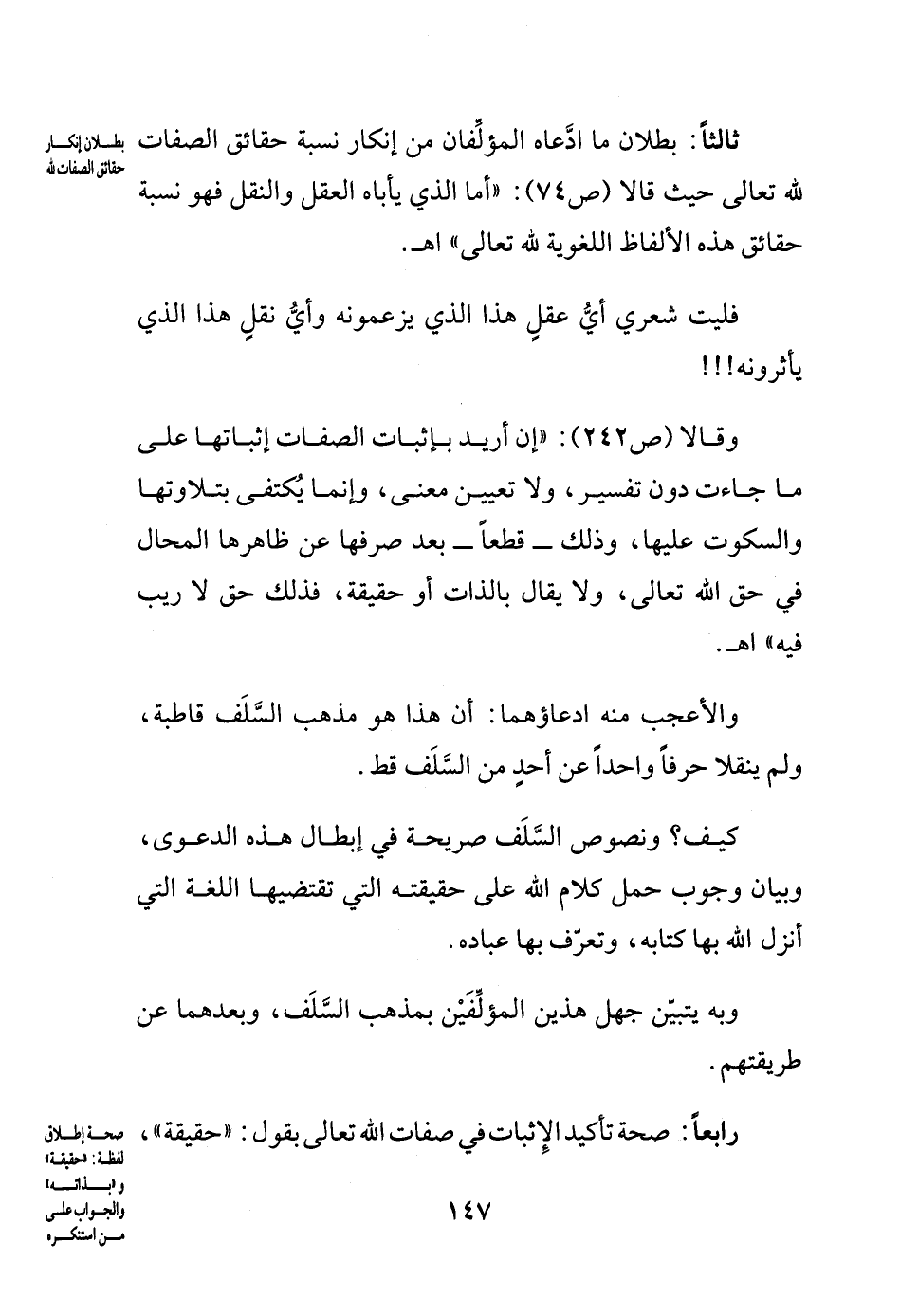 ثالثاً: بطلان ما ادعاه الأشعريان من إنكار نسبة حقائق الصفات لله تعالى حيث قالا (ص 74): (أما الذي يأباه العقل والنقل فهو نسبة حقائق هذه الألفاظ اللغوية لله تعالى) اهـ.