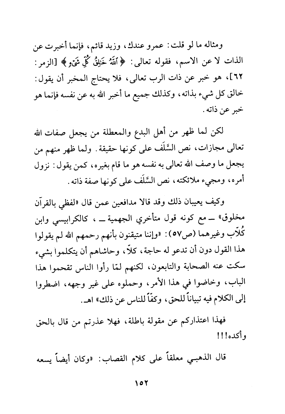 ومثاله ما لو قلت: عمرو عندك، وزيد قائم، فإنما أخبرت عن الذات لا عن الاسم، فقوله تعالى: {الله خالق كل شيء} الزمر62، هو خبر عن ذات الرب تعالى، فلا يحتاج المخبر أن يقول: خالق كل شيء بذاته، وكذلك جميع ما أخبر الله به عن نفسه فإنما هو خبر عن ذاته.
