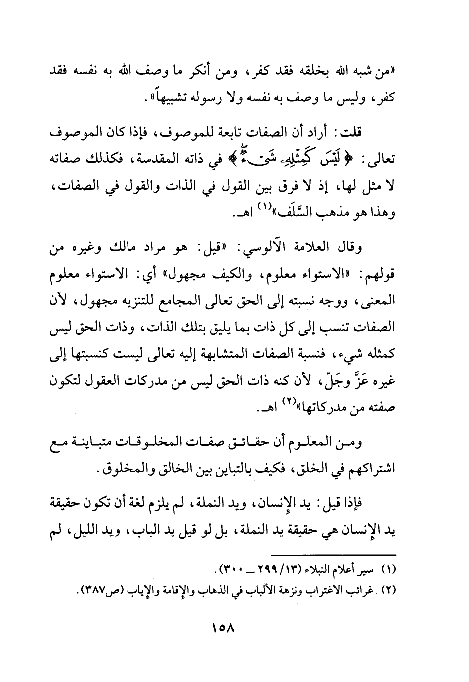 وقال العلامة الألوسي: (قيل: هو مراد مالك وغيره من قولهم: "الاستواء معلوم، والكيف مجهول" أي: الاستواء معلوم المعنى، ووجه نسبته إلى الحق تعالى المجامع للتنزيه مجهول، لأن الصفات تنسب إلى كل ذات بما يليق بتلك الذات، وذات الحق ليس كمثله شيء، فنسبة الصفات المتشابهة إليه تعالى ليست كنسبتها إلى غيره عز وجل، لأن كنه ذات الحق ليس من مدركات العقول لتكون صفته من مدركاتها) (¬2) اهـ.