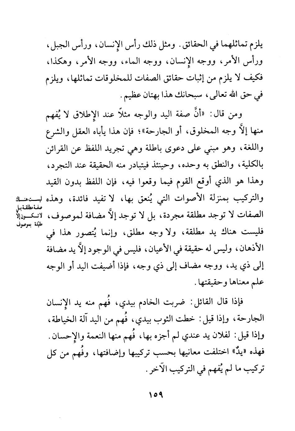 ومن قال أن صفة اليد والوجه مثلاً عند الإطلاق لا يُفهم منها إلا وجه المخلوق، أو الجارحة، فإن هذا يأباه العقل والشرع واللغة، وهو مبني على دعوى باطلة وهي تجريد اللفظ عن القرائن بالكلية، والنطق به وحده، وحينئذ فيتبادر منه الحقيقة عند التجرد، وهذا هو الذي أوقع القوم فيما وقعوا فيه، فإن اللفظ بدون القيد والتركيب بمنزلة الأصوات التي يُنعق بها، لا تفيد فائدة، وهذه الصفات لا توجد مطلقة مجردة، بل لا توجد إلى مضافة لموصوف، فليست هناك يد مطلقة، ولا وجه مطلق، وإنما يُتصور هذا في الأذهان، وليس له حقيقة في الأعيان، فليس في الوجود إلا يد مضافة إلى ذي يد، ووجه مضاف إلى ذي وجه، فإذا أضيفت اليد أو الوجه علم معناها وحقيقتها.