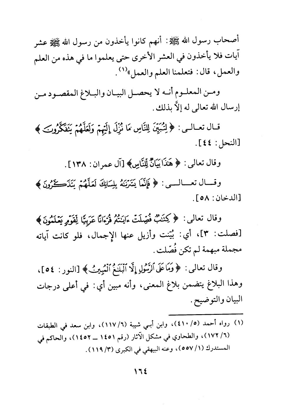 وقال تعالى: {وَمَا عَلَى الرَّسُولِ إِلَّا الْبَلَاغُ الْمُبِينُ} النور 54، وهذا البلاغ يتضمن بلاغ المعنى، وأنه مبين أي: في أعلى درجات البيان والتوضيح.