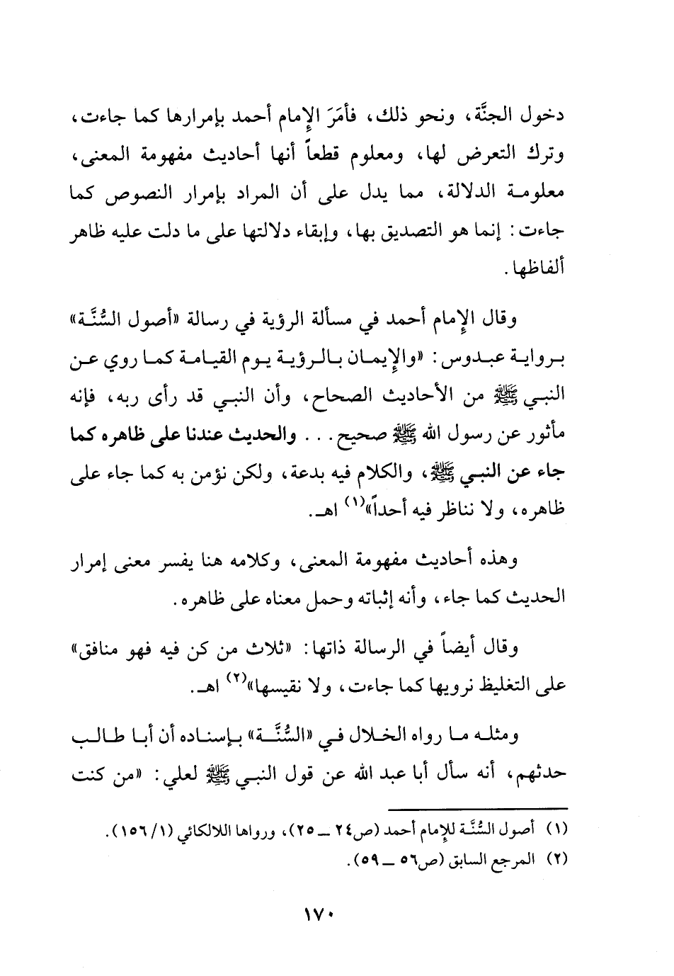 وقال الإمام أحمد في مسألة الرؤية في رسالة "أصول السنة" برواية عبدوس: (والإيمان بالرؤية يوم القيامة كما روي عن النبي - صلى الله عليه وسلم - من الأحاديث الصحاح، وأن النبي قد رأى ربه، فإنه مأثور عن رسول الله - صلى الله عليه وسلم - صحيح، ... والحديث عندنا على ظاهره كما جاء عن النبي - صلى الله عليه وسلم -، والكلام فيه بدعة، ولكن نؤمن به كما جاء على ظاهره، ولا نناظر فيه أحداً .. ) (¬1) اهـ.