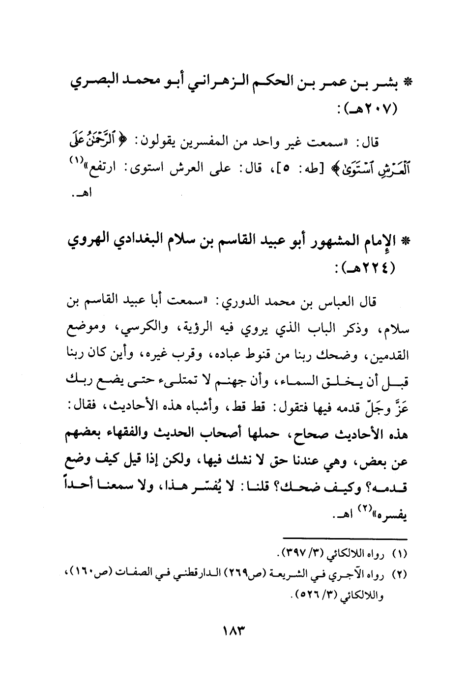 قال العباس بن محمد الدوري: (سمعت أبا عبيد القاسم بن سلام، وذكر الباب الذي يروي فيه الرؤية، والكرسي، وموضع القدمين، وضحك ربنا من قنوط عباده، وقرب غيره، وأين كان ربنا قبل أن يخلق السماء، وأن جهنم لا تمتلئ حتى يضع ربك عز وجل قدمه فيها فتقول: قط قط، وأشباه هذه الأحاديث، فقال: هذه الأحاديث صحاح، حملها أصحاب الحديث والفقهاء بعضهم عن بعض، وهي عندنا حق لا نشك فيها، ولكن إذا قيل كيف وضع قدمه؟ وكيف ضحك؟ قلنا لا يفسر هذا ولا سمعنا أحداً يفسره) (¬2) اهـ.