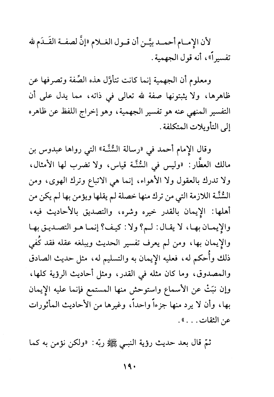 وقال الإمام أحمد في رسالة السنة التي رواها عبدوس بن مالك العطار: (وليس في السنة قياس، ولا تضرب لها الأمثال، ولا تدرك بالعقول ولا الأهواء، إنما هي الاتباع وترك الهوى، ومن السنة اللازمة التي من ترك منها خصلة لم يقلها ويؤمن بها لم يكن من أهلها: الإيمان بالقدر خيره وشره، والتصديق بالأحاديث فيه، والإيمان بها، لا يقال لم؟ ولا كيف؟ إنما هو التصديق بها والإيمان بها، ومن لم يعرف تفسير الحديث ويبلغه عقله فقد كُفي ذلك وأُحكم له، فعليه الإيمان به والتسليم له، مثل حديث الصادق والمصدوق، وما كان مثله في القدر، ومثل أحاديث الرؤية كلها، وإن نبت عن الأسماع واستوحش منها المستمع فإنما عليه الإيمان بها، وأن لا يرد منها جزءاً واحداً، وغيرها من الأحاديث المأثورات عن الثقات ... ) ثم قال بعد حديث رؤية النبي - صلى الله عليه وسلم - ربه: (ولكن نؤمن به كما
