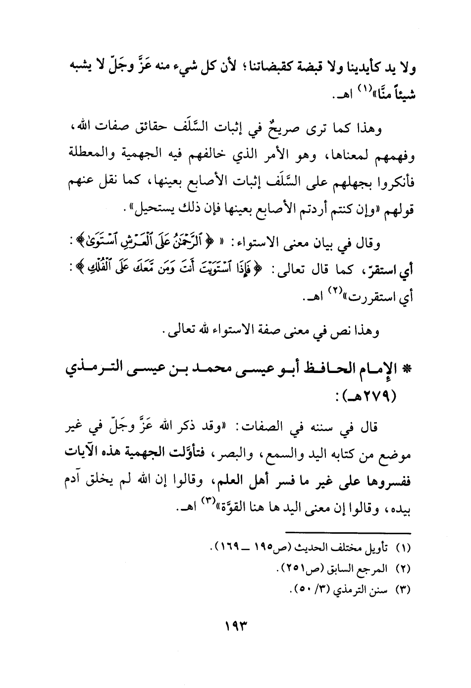 قال في سننه في الصفات: (وقد ذكر الله عز وجل في غير موضع من كتابه اليد والسمع، والبصر، فتأولت الجهمية هذه الآيات ففسروها على غير ما فسر أهل العلم، وقالوا إن الله لم يخلق آدم بيده، وقالوا إن معنى اليد ها هنا القوة) (¬3) اهـ.