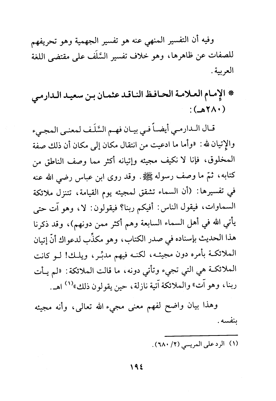 قال الدارمي أيضاً في بيان فهم السلف لمعنى المجيء والإتيان لله: (وأما ما ادعيت من انتقال مكان إلى مكان أن ذلك صفة المخلوق، فإنا لا نكيف مجيئه وإتيانه أكثر مما وصف الناطق من كتابه، ثم ما وصف رسوله - صلى الله عليه وسلم -. وقد روى ابن عباس - رضي الله عنه - في تفسيرها: أن السماء تشقق لمجيئه يوم القيامة، تتنزل ملائكة السماوات، فيقول الناس: أفيكم ربنا؟ فبقولون: لا، وهو آت حتى يأتي الله في أهل السماء السابعة وهم أكثر ممن دونهم، وقد ذكرنا هذا الحديث بإسناده في صدر الكتاب، وهو مكذب لدعواك انه إتيان الملائكة بأمره دون مجيئه، لكنه فيهم مدبِّر، ويلك! لو كانت الملائكة هي التي تجيء وتأتي دونه ما قالت الملائكة: "لم يأت ربنا وهو آت" والملائكة آتية نازلة، حين يقولون ذلك) (¬1) اهـ.