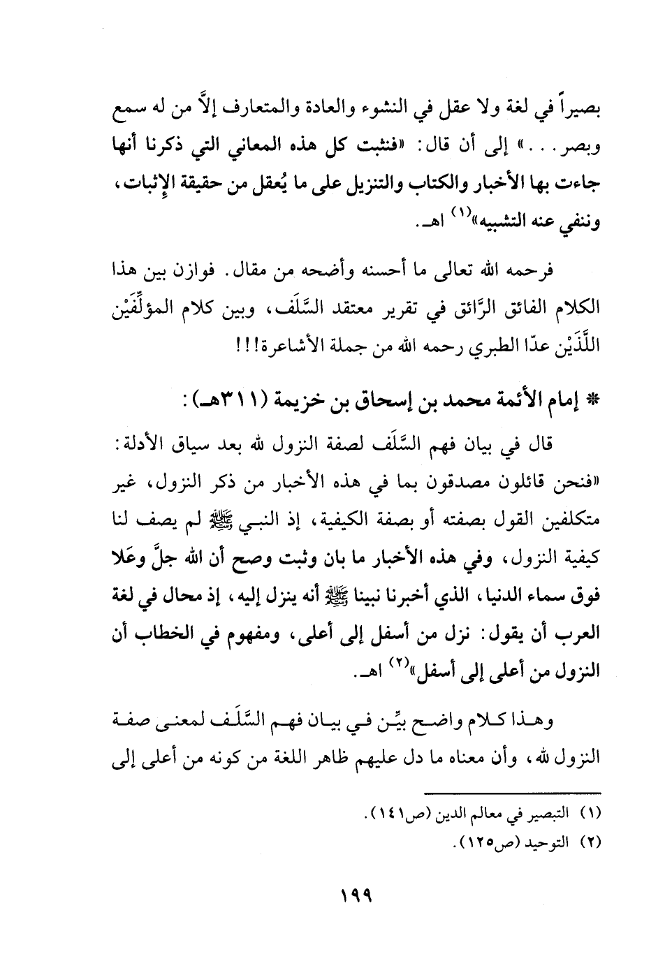 فرحمه الله تعالى ما أحسنه وأضحه من مقال. فوازن بين هذا الكلام الفائق الرائق في تقرير معتقد السلف، وبين كلام الأشعريّيْن الذين عدا الطبري رحمه الله من جملة الأشاعرة!!!