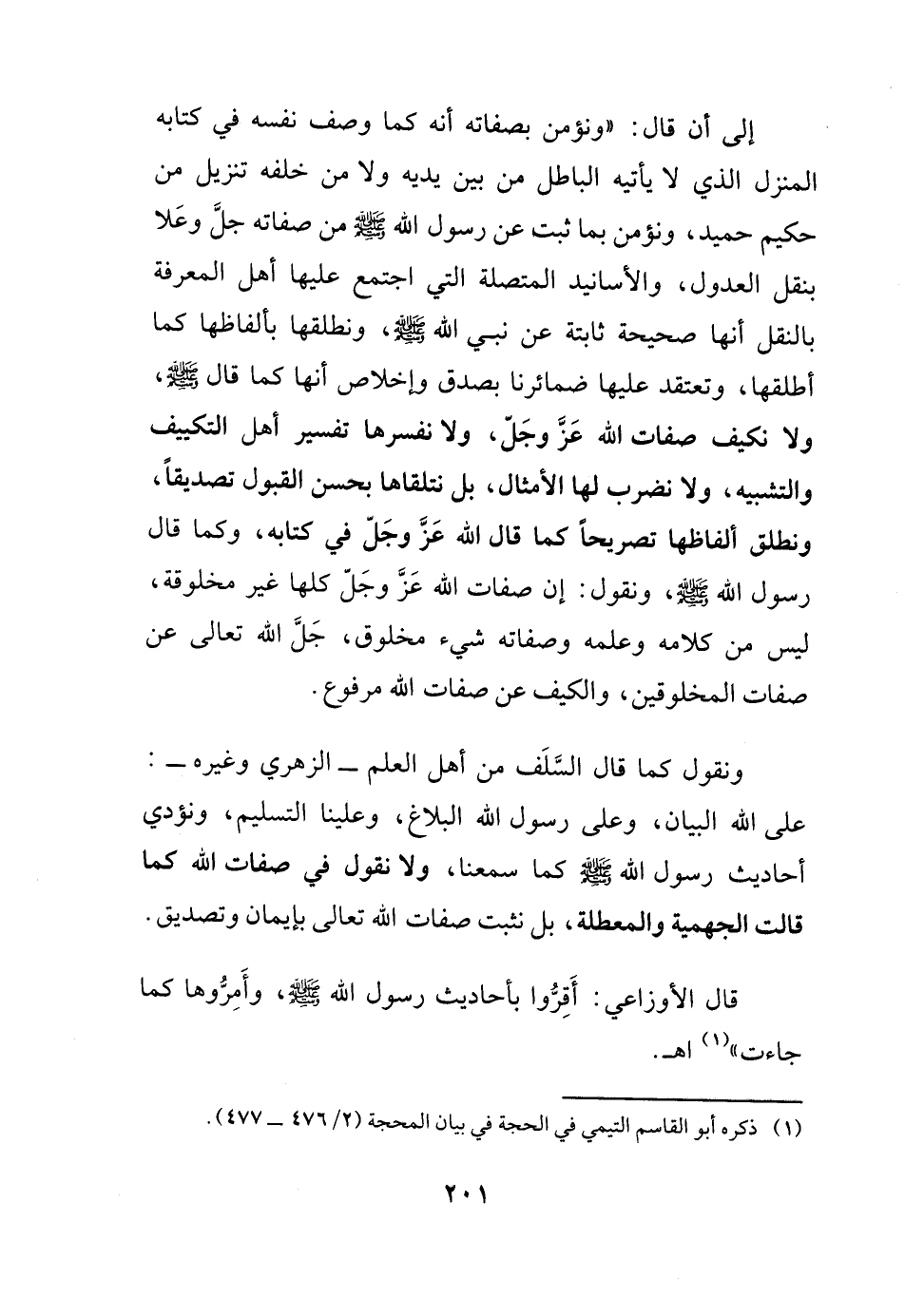 ونقول كما قال السلف من أهل العلم الزهري وغيره: على الله البيان وعلى رسول الله البلاغ، وعلينا التسليم، ونؤدي أحاديث رسول الله - صلى الله عليه وسلم - كما سمعنا، ولا نقول في صفات الله كما قالت الجهمية والمعطلة، بل نثبت صفات الله تعالى بإيمان وتصديق.