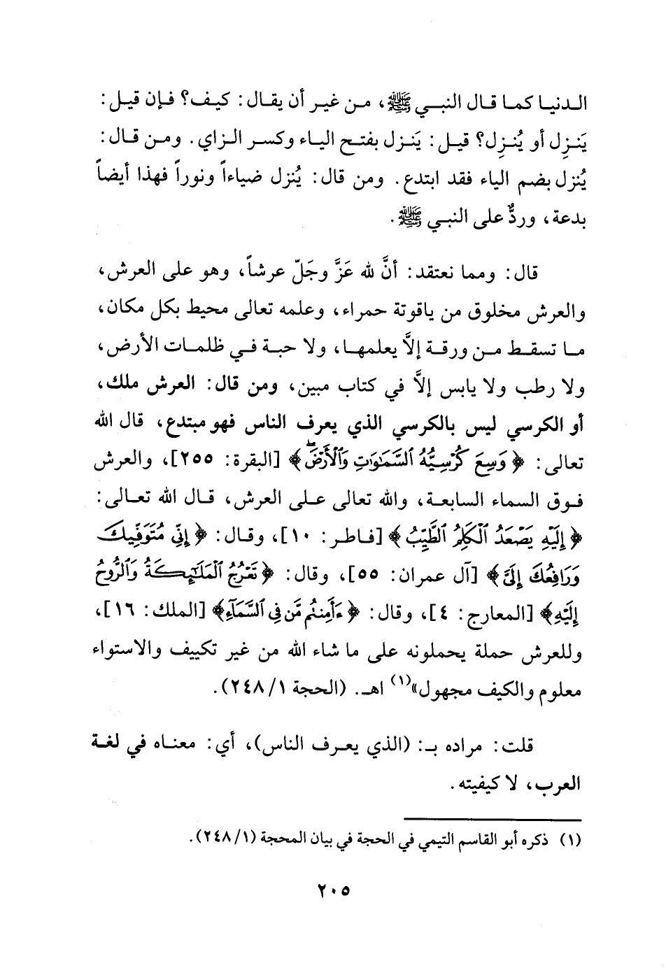 قال: ومما نعتقد أن لله عز وجل عرشاً، وهو على العرش، والعرش مخلوق من ياقوتة حمراء، وعلمه تعالى محيط بكل مكان، ما تسقط من ورقة إلا يعلمها، ولا حبة في ظلمات الأرض، ولا رطب ولا يابس إلا في كتاب مبين، ومن قال: العرش ملك، أو الكرسي ليس بالكرسي الذي يعرف الناس فهو مبتدع، قال الله تعالى: {وسع كرسيه السماوات والأرض} البقرة255، والعرش فوق السماء السابعة، والله تعالى على العرش، قال الله تعالى: {إليه يصعد الكلم الطيب} فاطر10، وقال: {إني متوفيك ورافعك إلي} آل عمران55، وقال: {تعرج الملائكة والروح إليه} المعارج4، وقال: {أأمنتم من في السماء} الملك16، وللعرش حملة يحملونه على ما شاء الله من غير تكييف والاستواء معلوم والكيف مجهول) (¬1) اهـ.