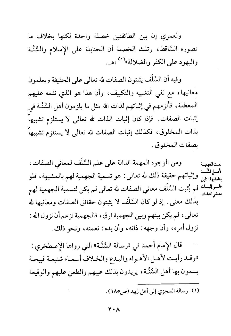 وفيه أن السلف يثبتون الصفات لله تعالى على الحقيقة ويعلمون معانيها، مع نفي التشبيه والتكييف، وأن هذا هو الذي نقمه عليهم المعطلة، فألزمهم في إثباتهم لذات الله مثل ما يلزمون أهل السنة في إثبات الصفات. فإذا كان إثبات الذات لله تعالى لا يستلزم تشبيهاً بذات المخلوق، فكذلك إثبات الصفات لله تعالى لا يستلزم تشبيهاً بصفات المخلوق.