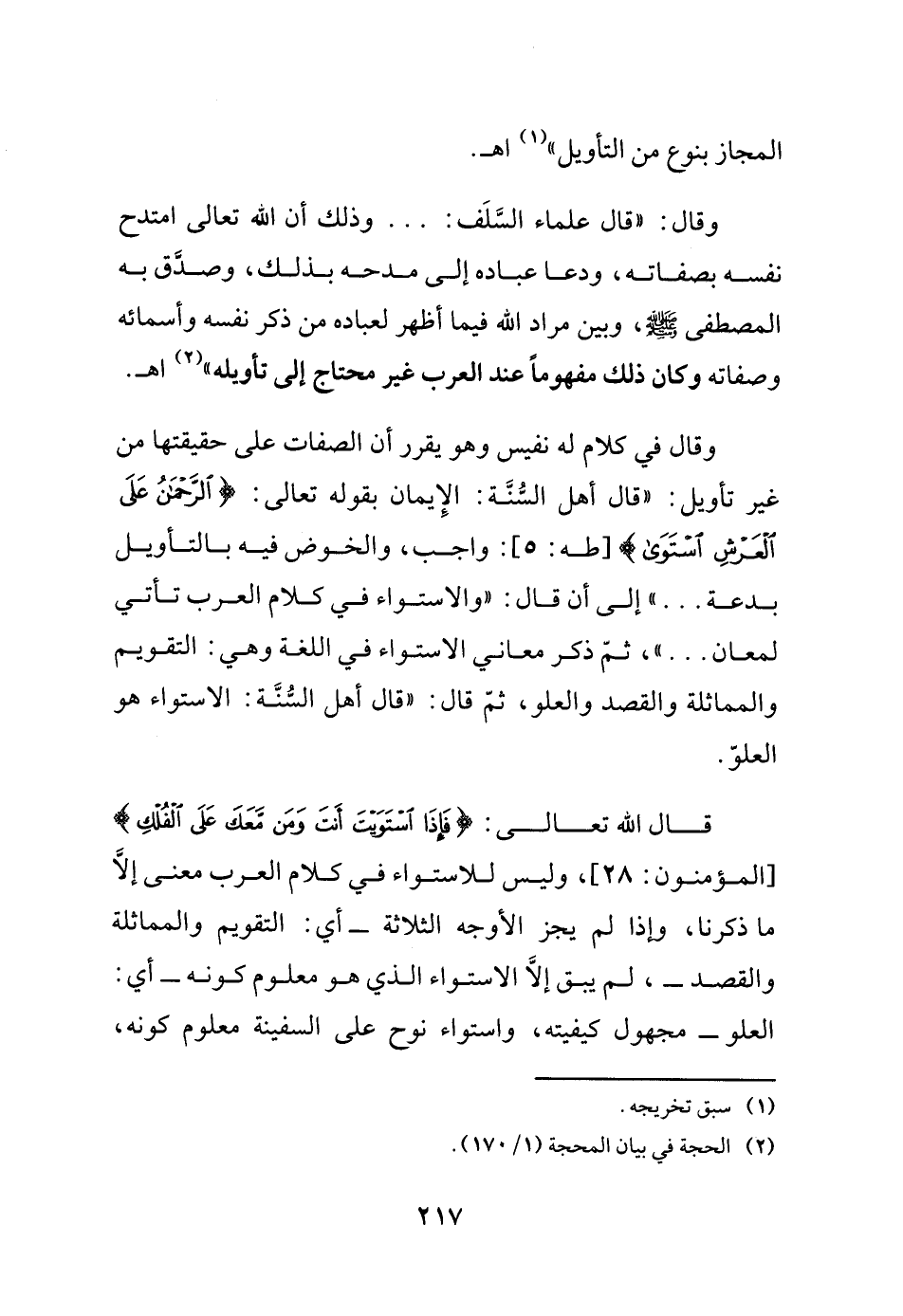 وقال في كلام له نفيس وهو يقرر أن الصفات على حقيقتها من غير تأويل: (قال أهل السنة: الإيمان بقوله تعالى: {الرحمن على العرش استوى} طه5، واجب، والخوض فيه بالتأويل بدعة .... ) إلى أن قال: (والاستواء في كلام العرب تأتي لمعان ... ) ثم ذكر معاني الاستواء في اللغة وهي التقويم والمماثلة والقصد والعلو، ثم قال: (قال أهل السنة: الاستواء هو العلو. قال الله تعالى {فإذا استويت أنت ومن معك على الفلك} المؤمنون28، وليس للاستواء في كلام العرب معنى إلا ما ذكرنا، وإذا لم يجز الأوجه الثلاثة -أي التقويم والمماثلة والقصد- لم يبق إلا الاستواء الذي هو معلوم كونه -أي العلو- مجهول كيفيته، واستواء نوح على السفينة معلوم كونه،