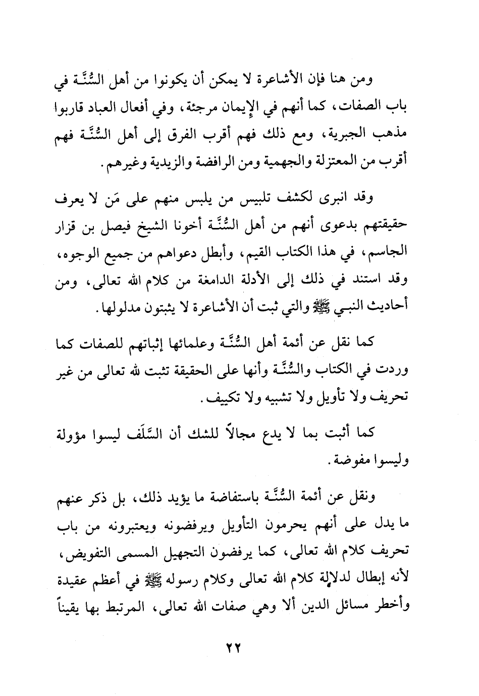 ومن هنا فإن الأشاعرة لا يمكن أن يكونوا من أهل السنة في باب الصفات، كما أنهم في الإيمان مرجئة، وفي أفعال العباد قاربوا مذهب الجبرية، ومع ذلك فهم أقرب الفرق إلى أهل السنة فهم أقرب من المعتزلة والجهمية ومن الرافضة والزيدية وغيرهم.
